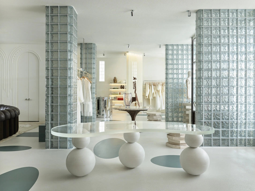 В интерьере все строится на нюансах и деталях — голубой оттенок стеклянных колонн поддерживается кругами и овалами на полу. Необычные стойки для манекенов представляют собой нагромождение декоративных полированных камней. Образ завершают винтажные предметы мебели — бруталистские французские табуреты 1950-х годов и модульный диван DS-600 швейцарского бренда De Sede, обитый кожей насыщенного шоколадно-коричневого цвета.