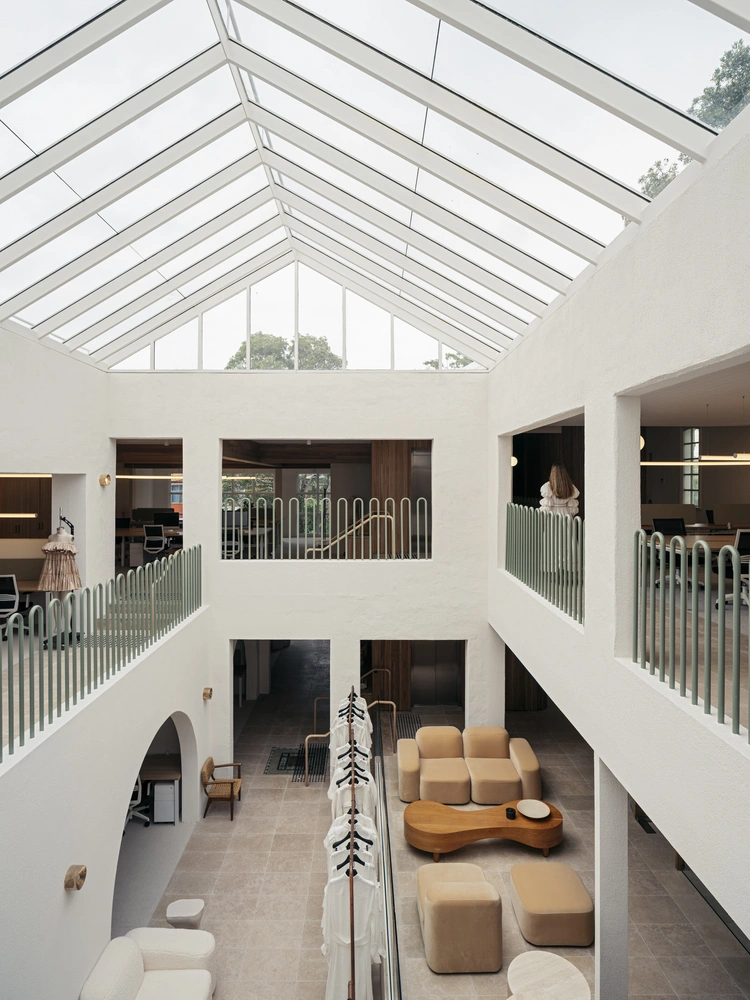 Весь интерьер выдержан в светлой цветовой гамме, разбавленной теплыми оттенками дерева, которые усиливают ощущение спокойствия и умиротворения. Единственный яркий элемент — изящная балюстрада цвета эвкалипта, очерчивающая второй уровень атриума.