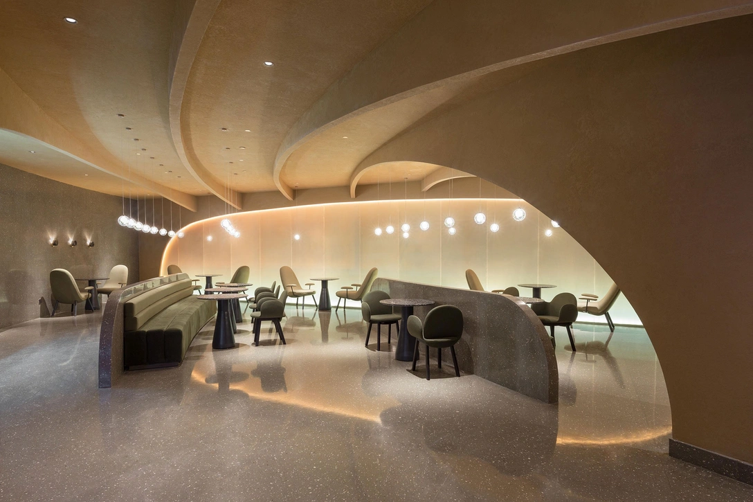 Путешествие гостей начинается с кафе Oasis, похожего на пещеру. Дизайн зала вдохновлен уникальной горной местностью города. Сложные изогнутые линии и округлые формы напоминают песчаные дюны и скалы в пустыне, среди которых странников поджидает сундук с сокровищами.