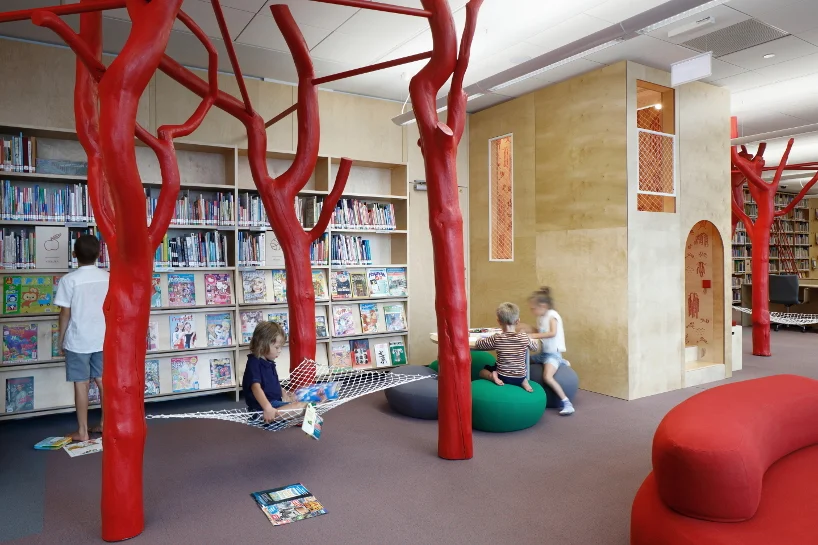 В новом читальном зале комфортно посетителям любого возраста. Каждый может найти свое идеально место для чтения: за письменным столом, на диване, в нише, в гамаке, висящем между красных сосен, в домике для игр или на вершине «холма». Пространство также доступно для детей, которые еще не умеют читать: они могут забраться в крошечный домик или найти одну из многих книжек с картинками, спрятанных в секретных отсеках.