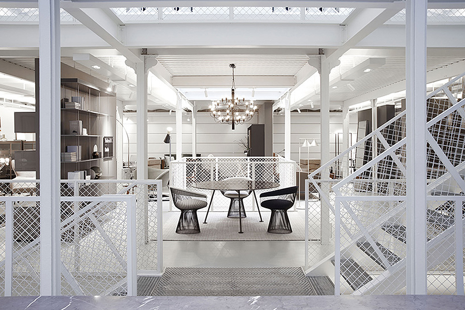 Все залы шоу-рума имеют открытую планировку: серые наливные полы и белые стены служат отличным фоном для дизайнерской мебели, которая продается в магазине, и не отвлекают внимание покупателей. Просторные белоснежные пространства соединены металлическими лестницами, в центре — трехэтажный атриум, также отделенный металлическими сетчатыми перилами.