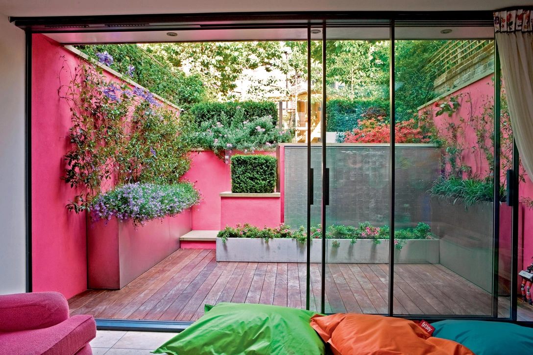 Англичане Питер и Синтия Миллер — неисправимые оптимисты. Видеть жизнь в розовом цвете им не мешает даже капризный британский климат. Поручая ландшафтному дизайнеру Стюарту Крейну (Stuart Craine) оформить свой сад в Ноттинг-Хилле, они выдвинули три требования: сад должен быть, во-первых, современным, во-вторых, безопасным для детей, в-третьих… все стены и ограды нужно сделать ярко-розовыми! «Признаться, поначалу эта идея меня ошарашила, — вспоминает Стюарт. — Будь моя воля, выбрал бы какой угодно цвет, только не этот! Но постепенно я с ним смирился». Другого выбора не было: хозяева, обставившие свой викторианский дом современной мебелью в розовых тонах, хотели, чтобы сад сочетался по колориту с интерьером.