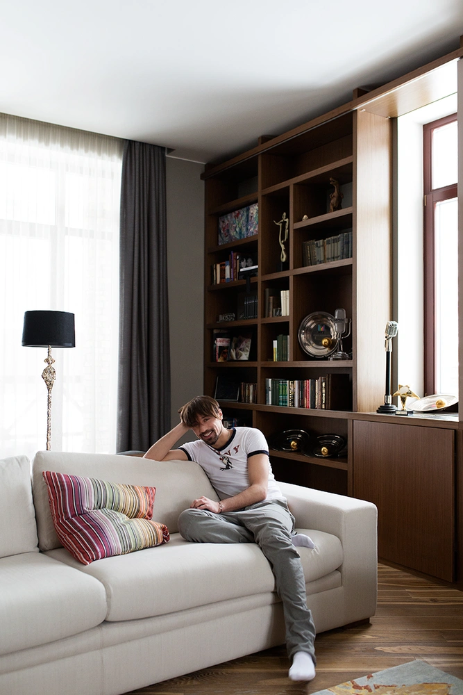 «Сначала мне хотелось интерьер в духе 1980-х, потом — 1960-х. В гостиной я думал разместить два подвесных кресла, перемещающихся по периметру на специальных рельсах. Но это было уже слишком, и в какой-то момент я решил остановиться. Дома все должно быть не напоказ, а для нормальной жизни, — признается Дима. — Мне очень помогла дизайнер Наталья Глуховская — вместе с ней мы начали искать более спокойный вариант».