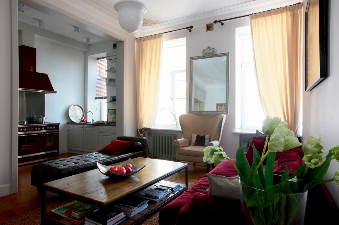 «Мне сразу понравилась эта квартира: высокие потолки (3,6 м), светлая (6 окон на 76 кв. м.), в старом доме (1914 года постройки). Единственный минус — неудобная линейная планировка, но мне удалось ее исправить и даже согласовать в бесконечных инстанциях. Я очень бережно отношусь к старине. Поэтому начал не столько с оформления интерьера, сколько с реставрации. Мы сняли слепки с остатков потолочной лепнины из папье-маше и изготовили такую же из гипса. Обмерили единственный сохранившийся радиатор и по его подобию отлили недостающие, очистили старую кирпичную кладку и наглухо залитые краской латунные решетки вентиляции. По московским меркам квартира небольшая. Так что мне очень пригодился опыт учебы и жизни во Франции. Парижане умеют выжимать максимум из каждого сантиметра — превращать подоконники в диваны, прятать под ними системы хранения, делать из узких технических ниш вместительные шкафы, втискивать гардеробные в такие места, где, казалось бы, и пройти-то нельзя. В этой квартире масса таких фокусов. Это было бы невозможно без встроенной мебели, сделанной по моим эскизам. Вообще, здесь много всего намешано. Слышны отголоски французской, грузинской и русской традиции — всего того, из чего соткана жизнь Софико».