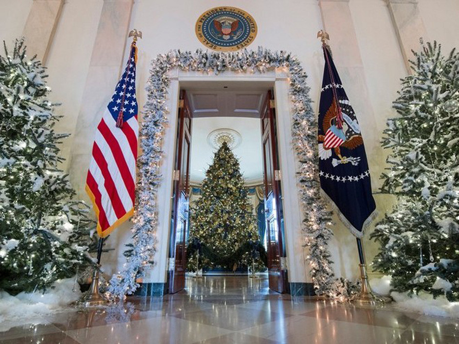 Для украшения одного из самых красивых помещений Белого дома Голубой комнаты, из штата Висконсин была превезена елка, высотой 5,5 метров. Всего в этом году на территории Белого дома установлены 52 рождественких ели разного размера.