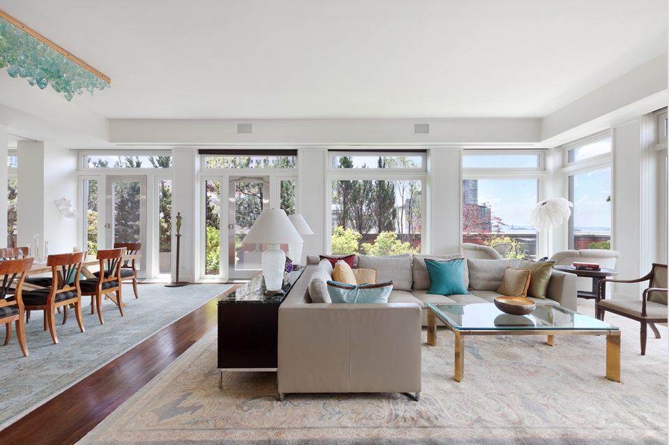 По периметру квартира окружена террасой, густо засаженной зеленью. С нее открывается потрясающий вид на реку Гудзон и окрестности Манхэттена.