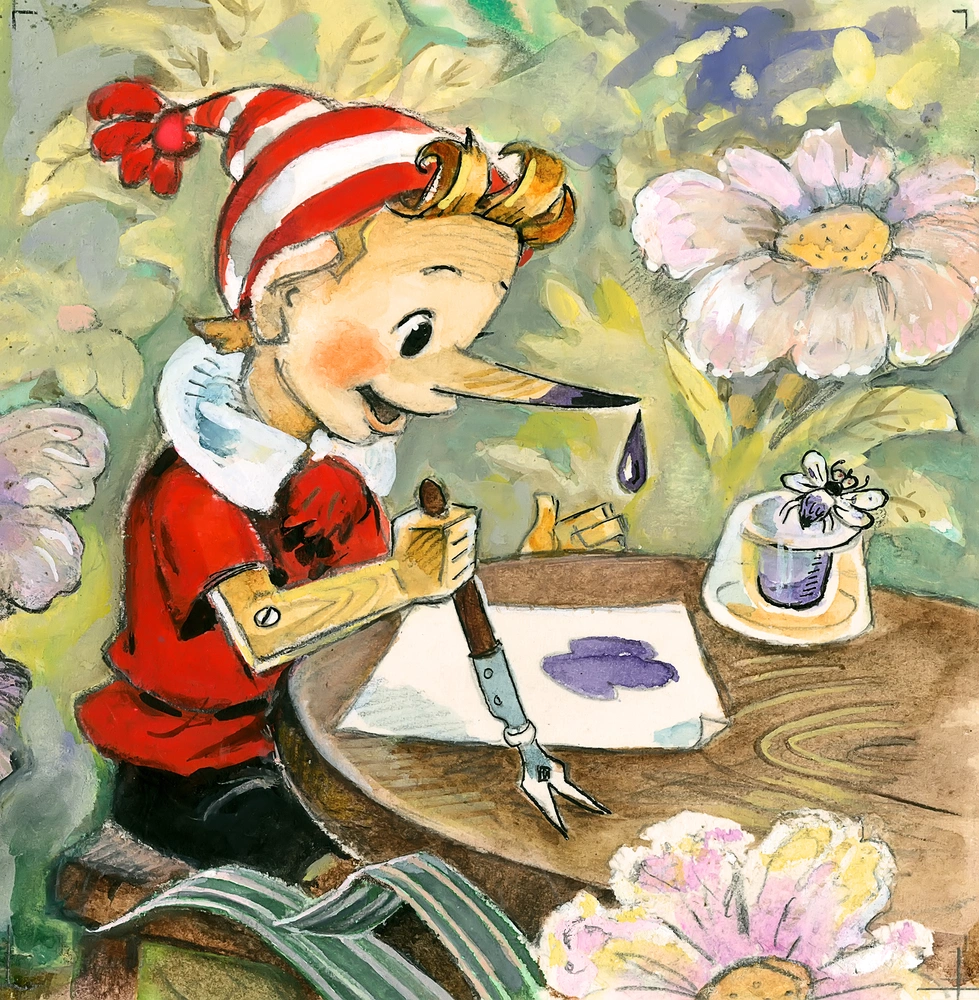 Кстати, вы знали, что считающийся сейчас каноническим образ Буратино, мальчика в полосатом красно-белом колпачке и с забавной челкой-стружкой, придумал именно Леонид Владимирский для диафильма 1953 года? А моделью была пятилетняя дочка художника Ая. С тех пор другого Буратино мы себе представить не можем.