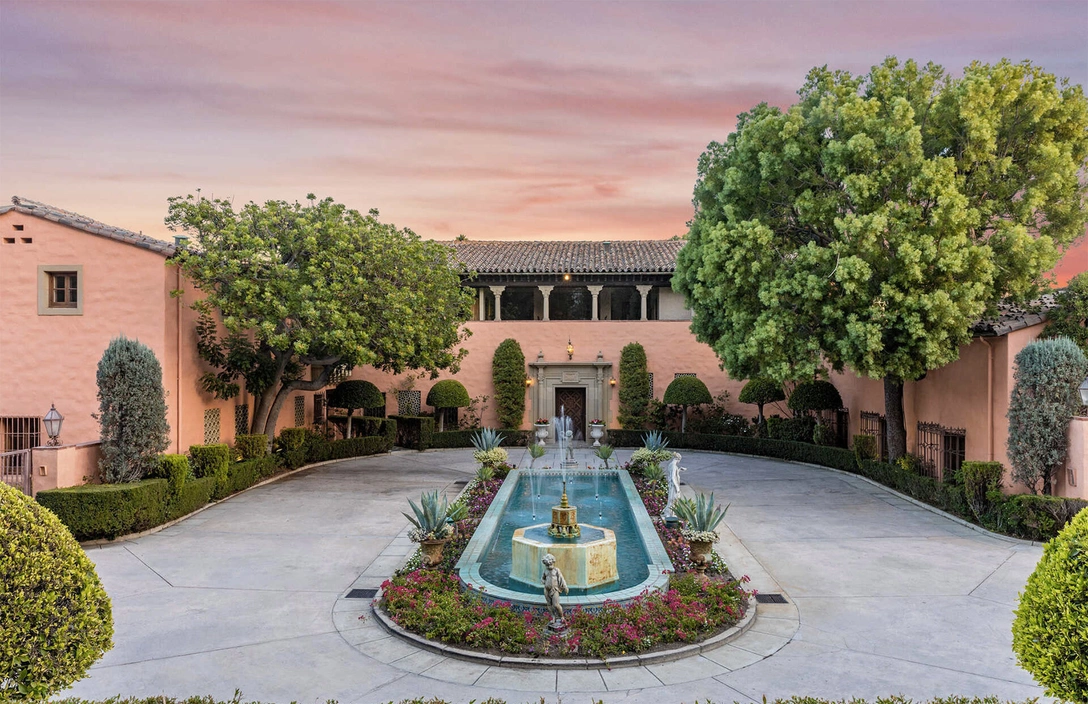 H-образный дом в Беверли-Хиллз расположен на ухоженной территории площадью 4645 кв. м и может похвастаться 18 спальнями, 25 ванными комнатами, собственным ночным клубом в стиле ар-деко, кинозалом и бассейном, который превосходит олимпийские стандарты. Ландшафтный архитектор Пол Тьен (Paul Thiene) создал богато украшенный сад с каскадными водопадами, напоминающий сады Италии и Франции.