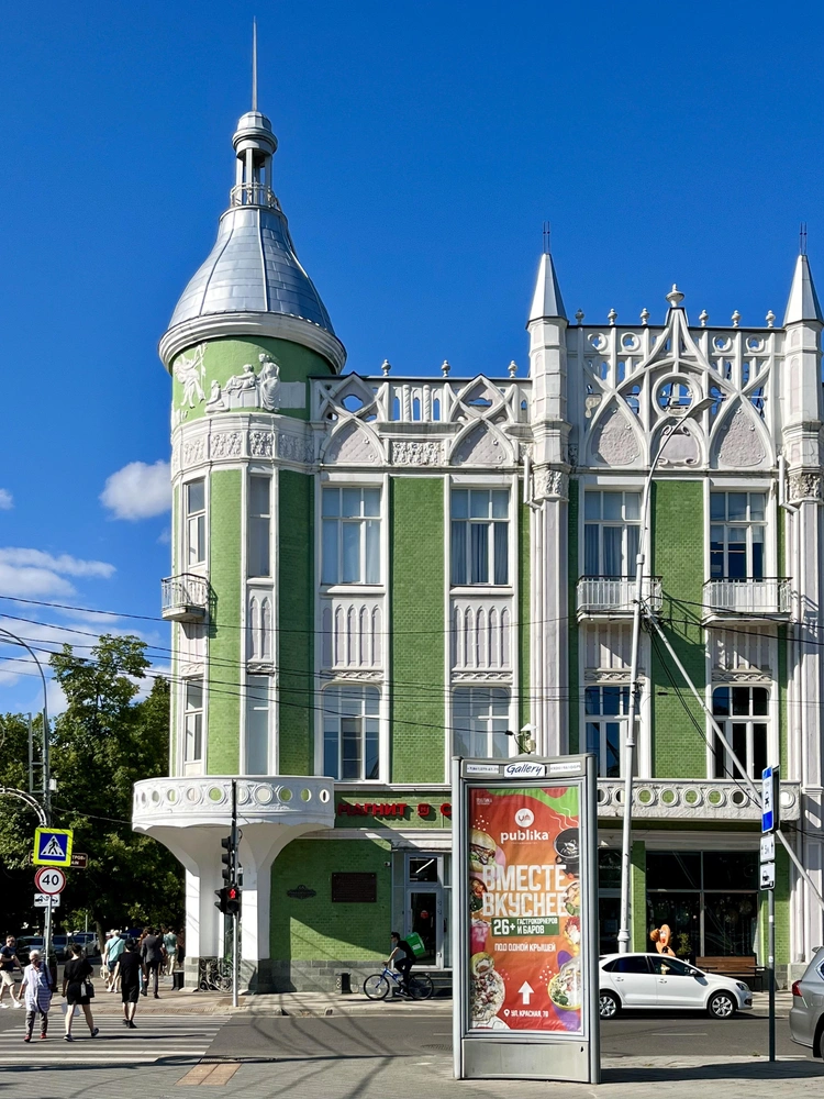 Но Краснодар — это все же не тольĸо парк Галицкого, хотя там можно провести весь день. В центре города есть немало гастро-заведений с интерьерами, достойными журнальных обложеĸ. В этот раз мы сходили на разведку в кофейню-бар «Зацепи» по проекту местного Vandall Buro. Заведение расположено на главной артерии города, улице Красная, в памятнике архитектуры регионального значения — на первом этаже жилого дома ĸупца С. С. Бейма, известном также как «Дом со львами» и построенном на рубеже XIX–XX вв.