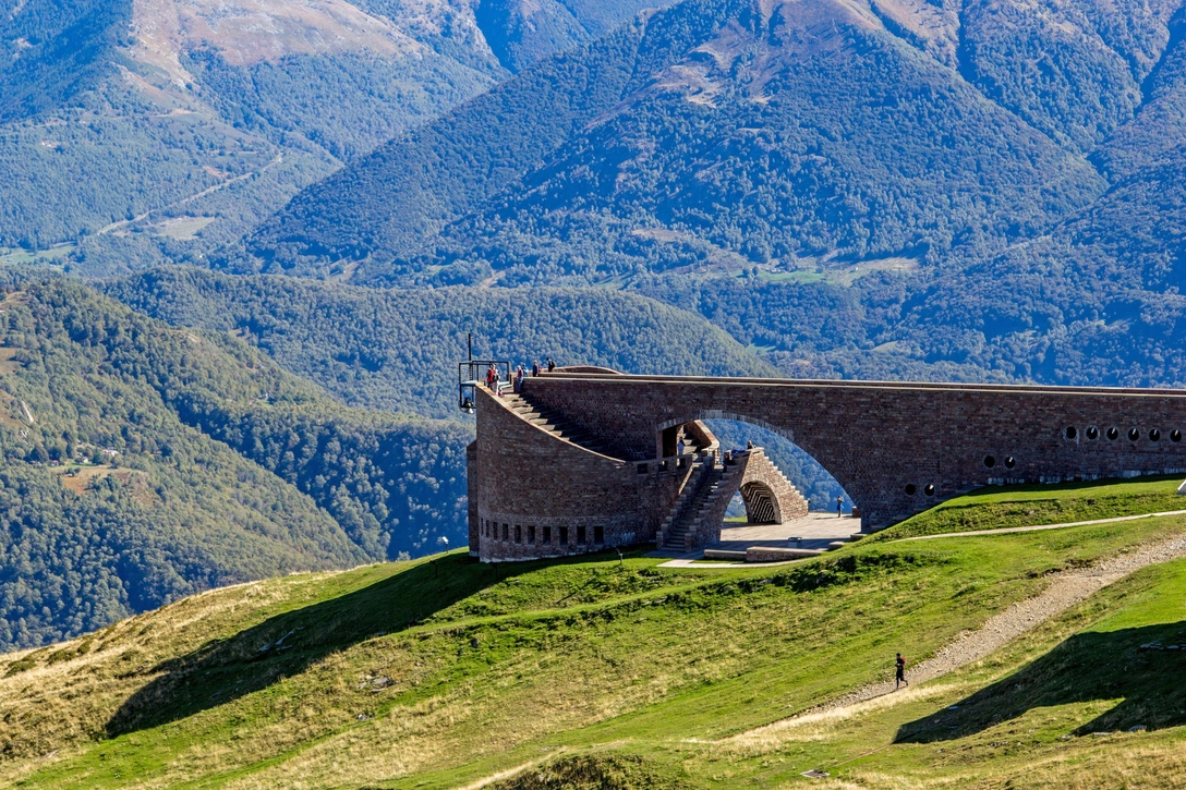 Расположенная на краю скального обрыва, эта часовня — один из самых драматичных проектов Ботты, где архитектура становится прямым продолжением пешеходного маршрута. К зданию ведет тропа, которая у самой террасы раздваивается: один путь направляет к смотровой площадке, другой — спускается между двумя высокими стенами ко входу. Примечательно, что сама кровля часовни выполнена в виде каменной лестницы из местного порфира, поднимающейся к горным пикам и приглашающей посетителей на еще один, верхний уровень обзора.
