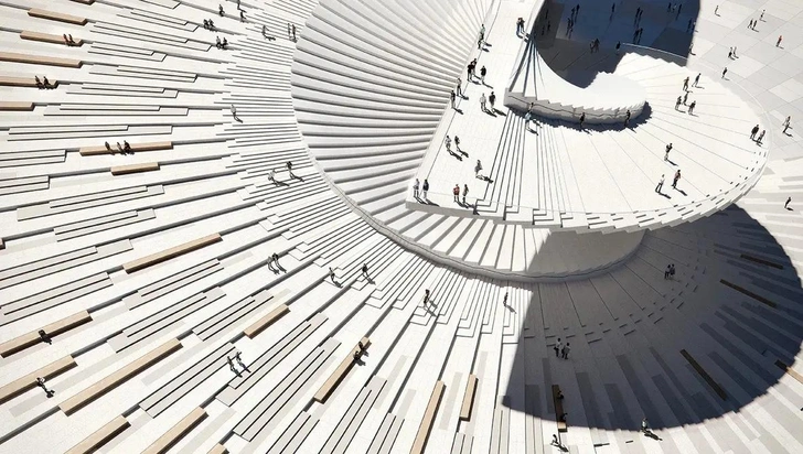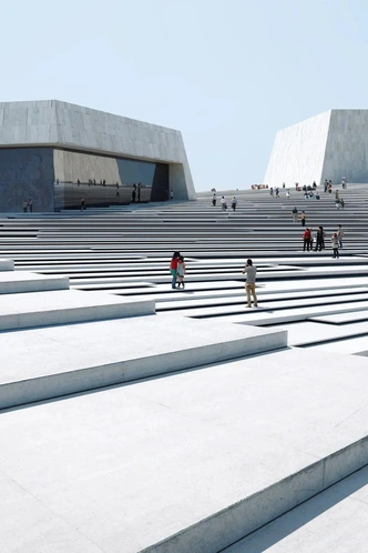 Шанхайский большой оперный театр отстроен на берегу реки Хуанпу в районе Пудун. Проект стал завершающим элементом Культурного парка Expo. Здание спроектировано бюро Snøhetta Architects. Его замысловатая форма — отсылка к китайскому складному вееру: спиральная крыша и белые изогнутые лестницы создают ощущение «парящей» конструкции. Спиралевидная структура продолжается и внутри: винтовая лестница соединяет наземный уровень с крышей, открывая виды на набережную.