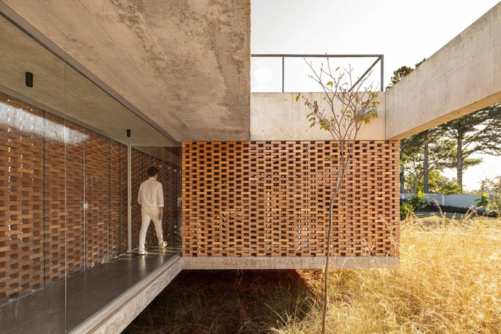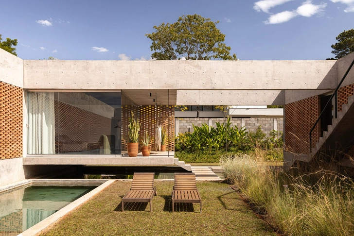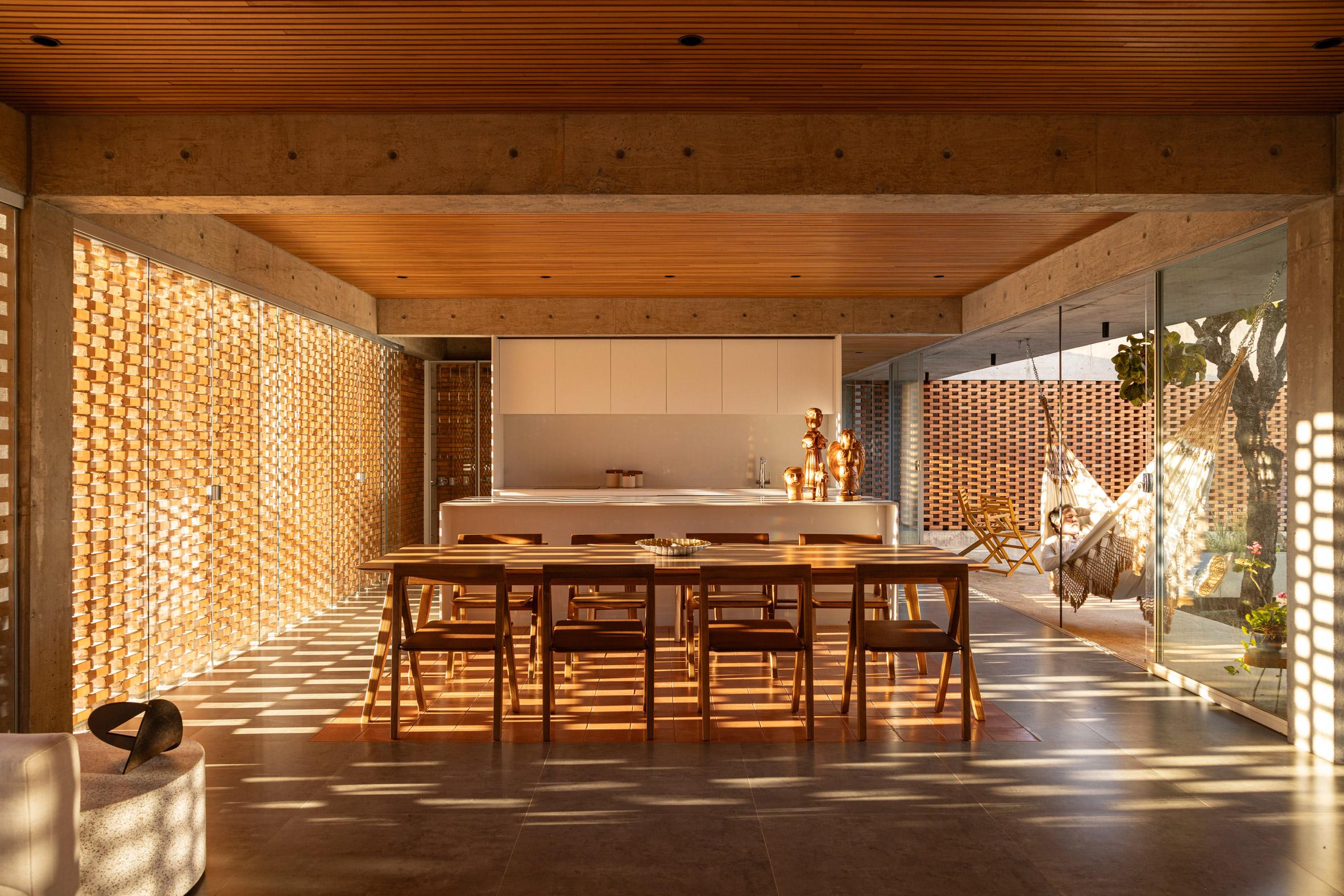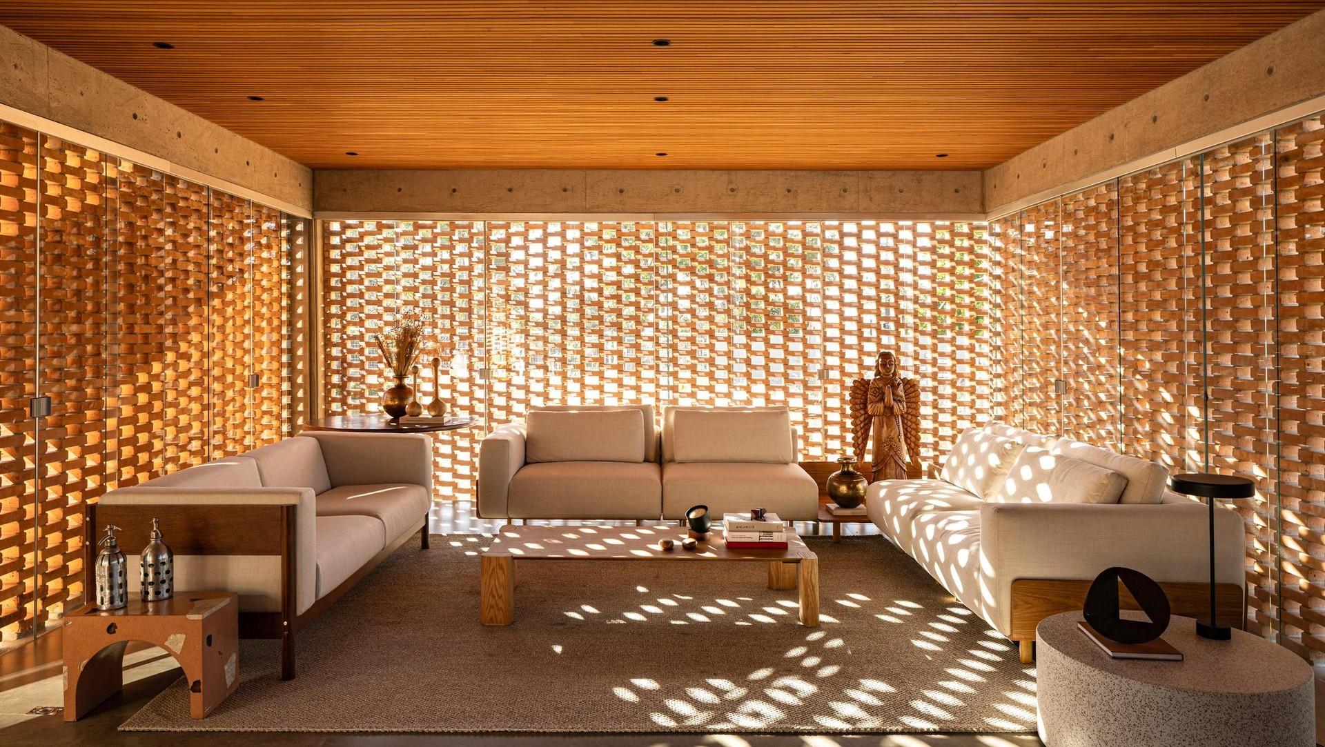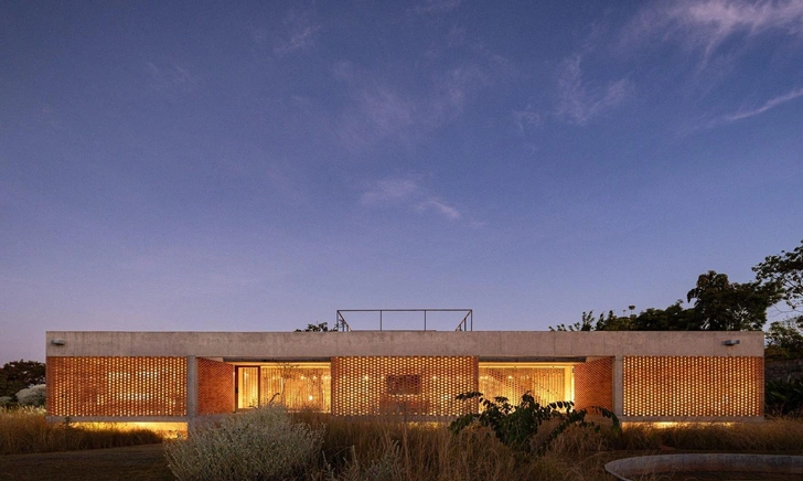 Такие стены из кирпича с отверстиями одновременно защищают от солнца и пропускают воздух. Воздух свободно циркулирует в любом направлении. Все комнаты устроены так, чтобы использовать эту систему — она объединяет конструкцию дома, вентиляцию и само ощущение пространства.
