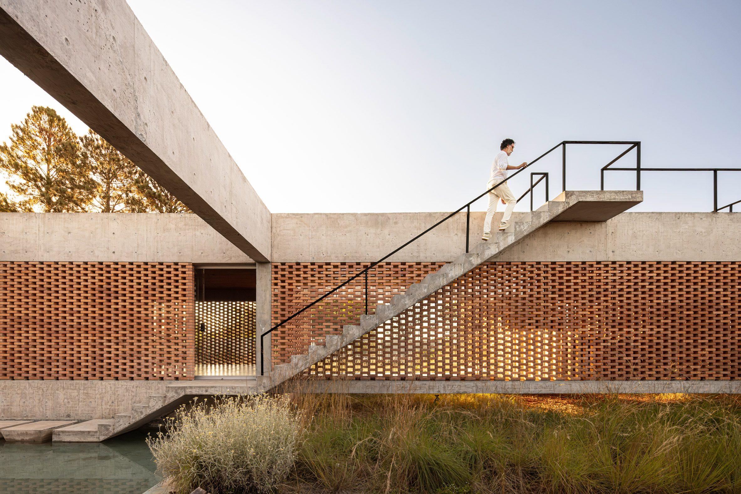 Вместо обычных окон здесь — вертикальные плоскости из кораллового кирпича. Где-то стена глухая, где-то сложена решеткой, как шлакоблок. Кирпич и бетон выбрали за их прочность и устойчивость к жаре. Неброская палитра позволяет свету, тени и времени стать частью архитектуры.