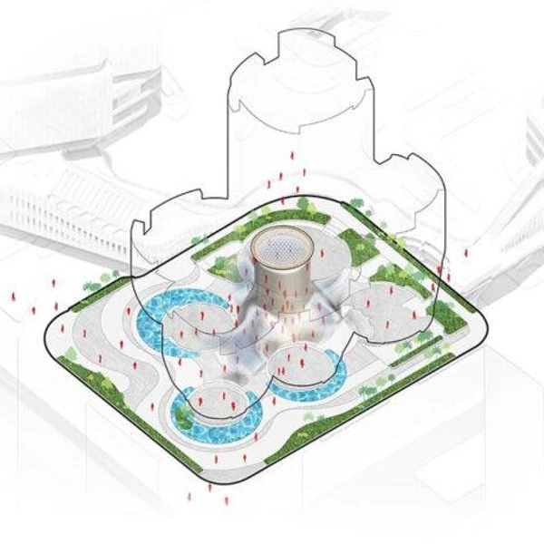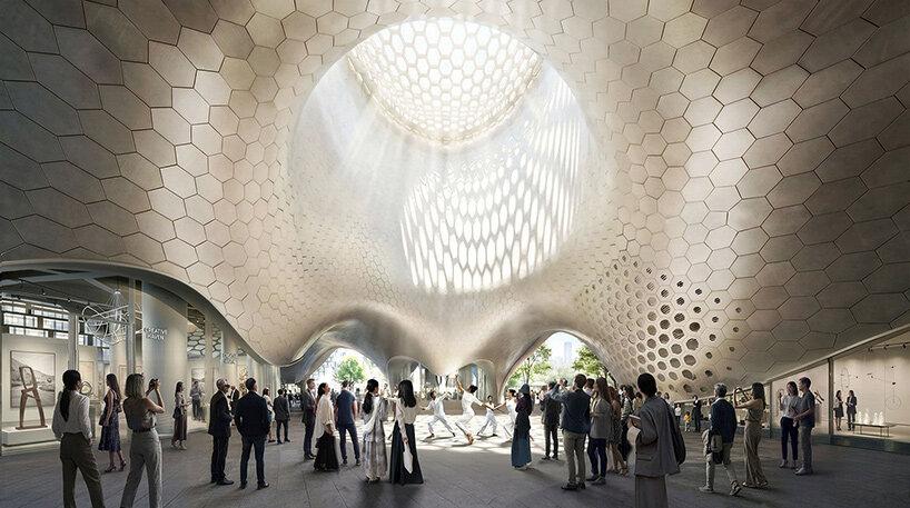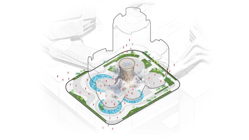 Это пространство работает как естественно вентилируемый форум, защищенный от солнца и дождя. Большое окно на крыше пропускает дневной свет вниз. Люди могут проходить здесь, собираться или просто отдыхать, даже не заходя в галереи.