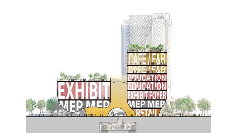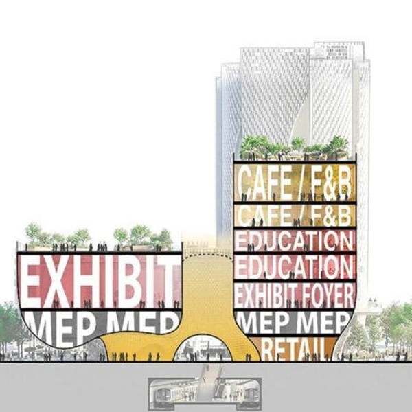 Фасад музея архитекторы из Buro Ole Scheeren облицевали горизонтальными слоями, которые ступенчато уходят назад по мере подъема здания. Поверх них есть и вторая оболочка — из подвесных стеклянных трубок. Они спроектированы параметрически, так что плотность и глубина поверхности меняются в разных частях здания.