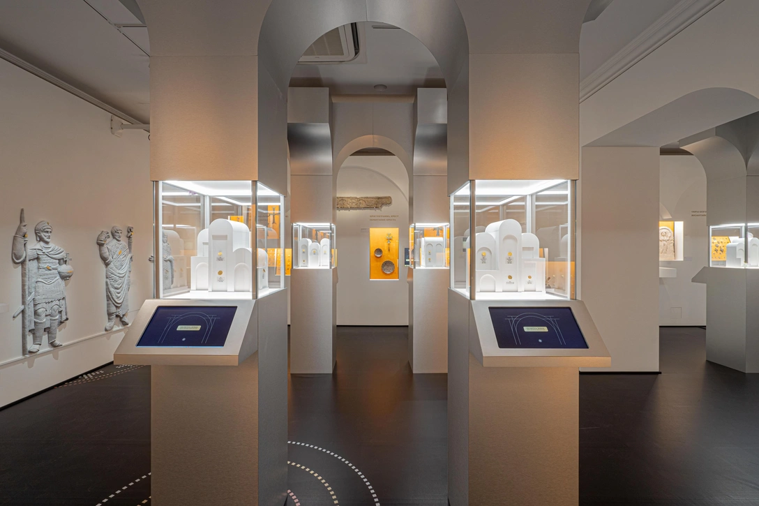 Специально для выставки были изготовлены рельефы с изображением византийских правителей, их фигуры можно потрогать и узнать тайный смысл элементов императорского облачения. Это реконструкция показывает этнографический образ императора, такие как, например, маппа, мешочек с прахом, символ бренности жизни; или копье, которое олицетворяет готовность защищать с оружием в руках веру Христову или лор, связывающий императора с образом Христа, а также державу: она символизирует Вселенную, земной шар с утвержденным на ней крестом — доминантой христианской религии.