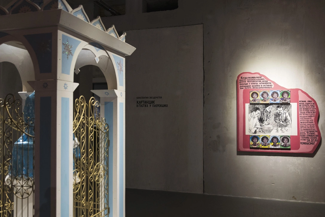 Здесь выставлена живопись и объекты 1980–2000-х годов, в которых Звездочетов работает с лубком, примитивом, журнальной карикатурой, визуальными клише массовой культуры и языком повседневности.