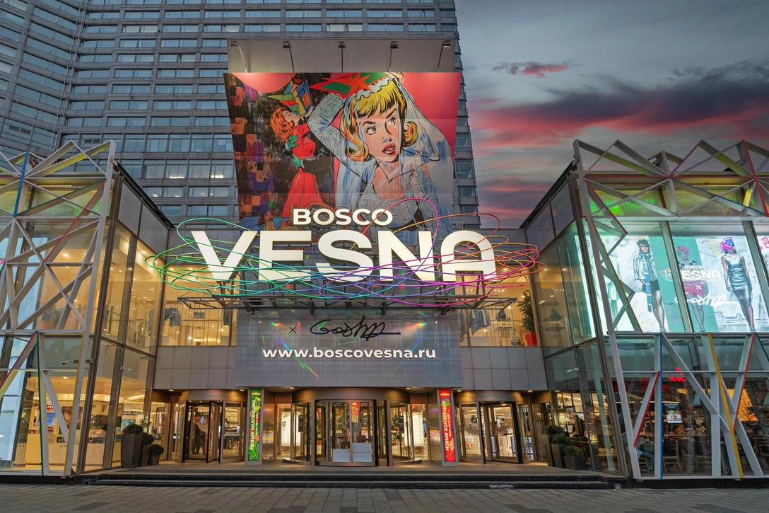 12 марта в BoscoVesna открылся арт-проект Гоши Острецова Haut Futur. Его работы украсили фасад здания и разместились на всех этажах торгового центра. Выставка стала персональным ответом художника на вопрос, что такое современное русское искусство и из каких традиций оно появилось.