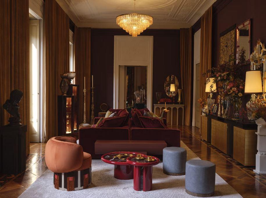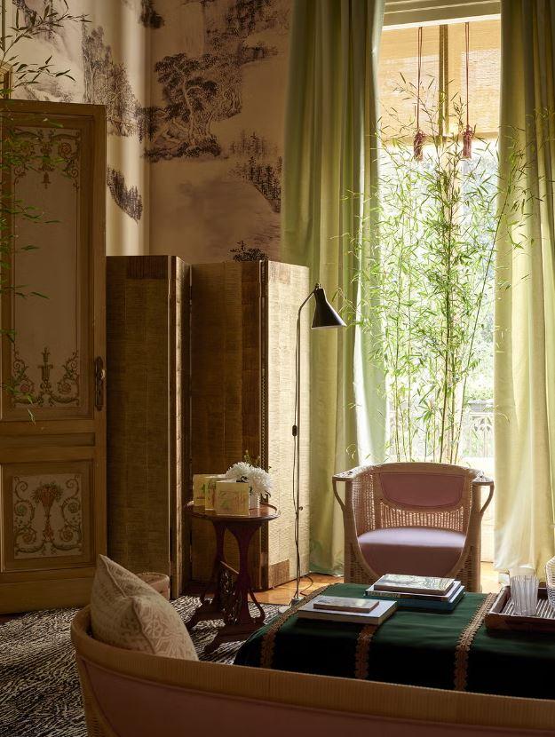Студия Charlap Hyman & Herrero Адама Чарлапа Хаймана и Андре Эрреро превратила две смежные комнаты в место отдыха, вдохновленное Палаццо Вальгуарнера-Ганги в Палермо, который фигурировало в фильме Лукино Висконти 1963 года «Леопард». «Интерьеры передают эмоциональное напряжение фильма», — говорит Адам Чарлап Хайман, — Места для сидения расположены так, чтобы создать ощущение простора для беседы. Мы включили в обстановку комплект мебели из розового ротанга от Милы Мауризи и несколько приставных столиков Гаэтано Пеше».