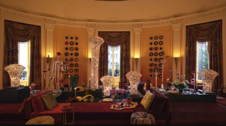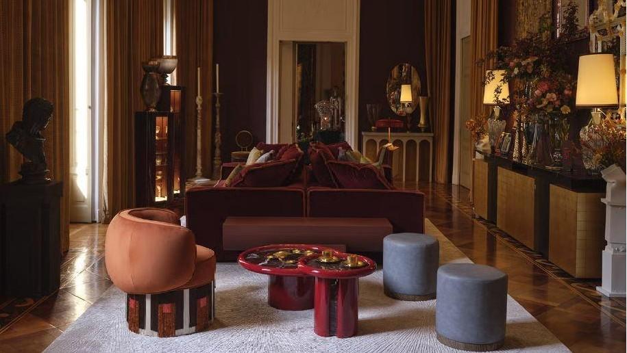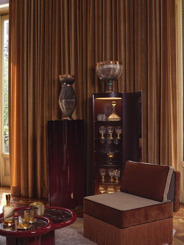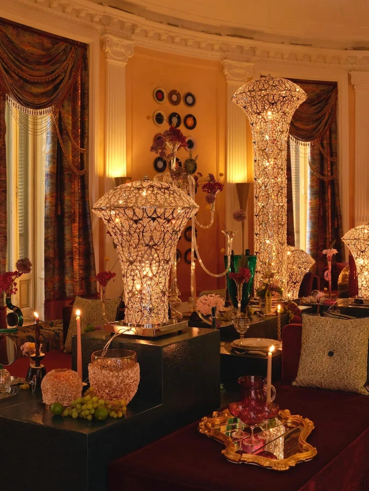 Театральность, роскошь и античное наследие неаполитанской земли сливаются в лаунж-зоне, куда поставили кушетки и многоярусные столы, напоминающие об античном триклинии и превращающие совместную трапезу в коллективный перформанс. Среди представленных объектов — бархатные кресла с бахромой Lorenza Bozzoli Couture и красочные тарелки Incalmi.