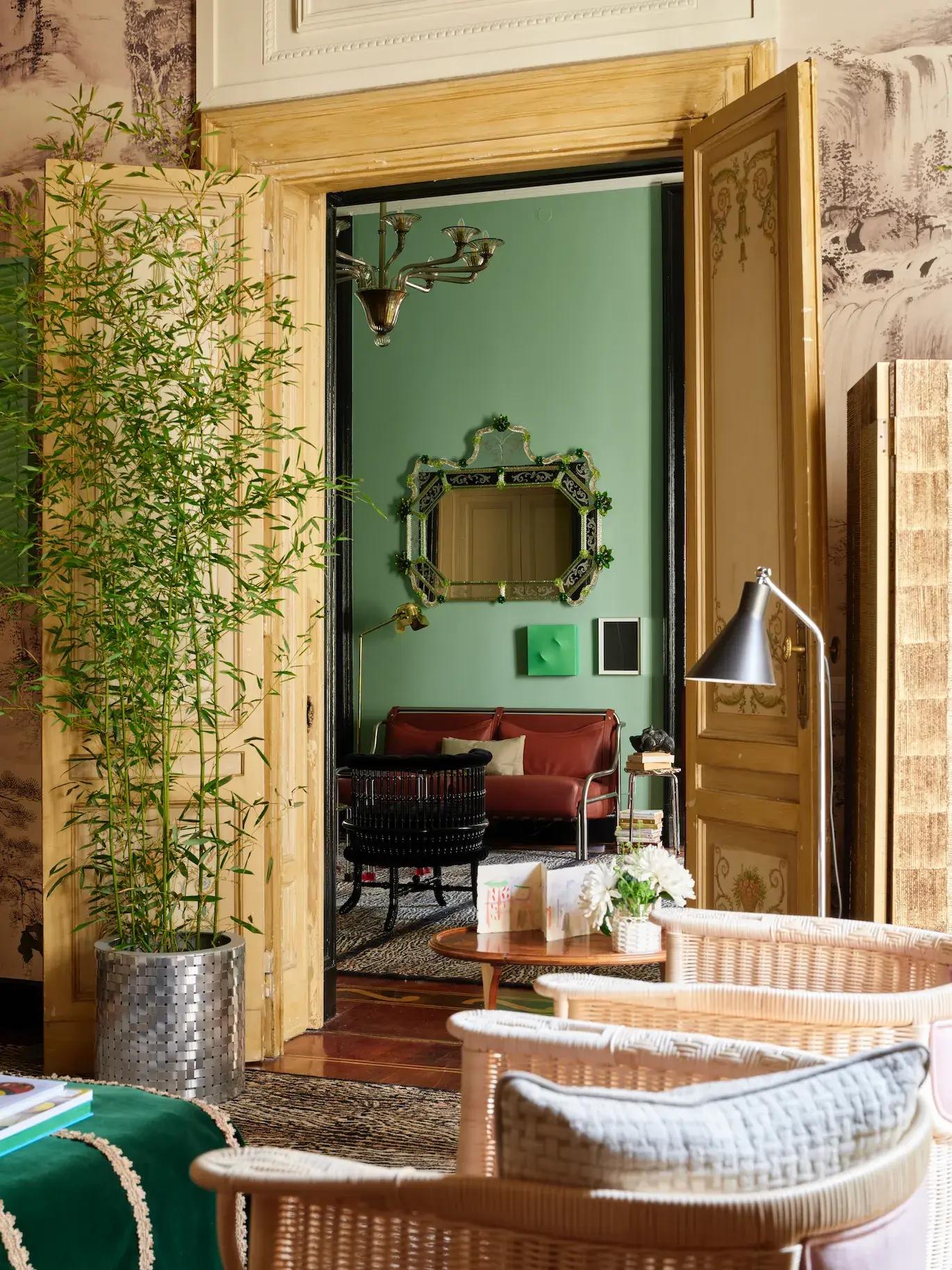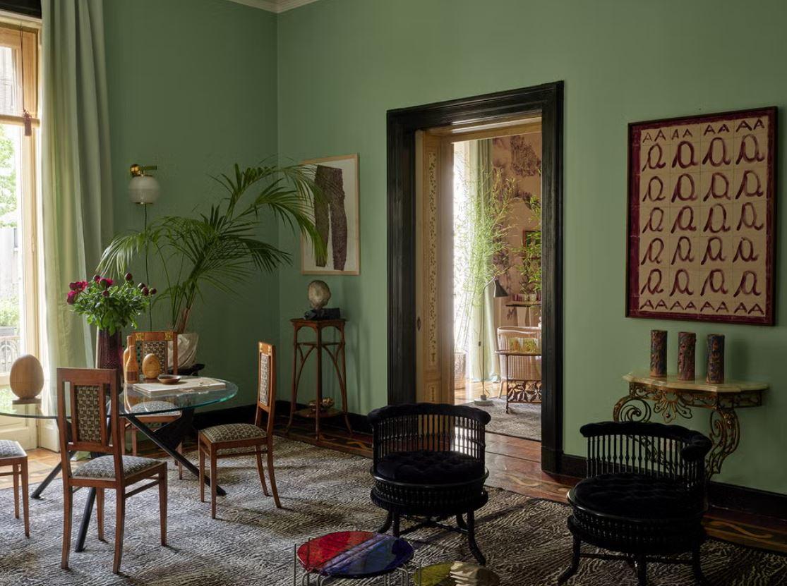 Вторая комната со стенами оттенка шалфея и деталями красного и пурпурного цветов, предлагает утонченную, меланхоличную атмосферу.