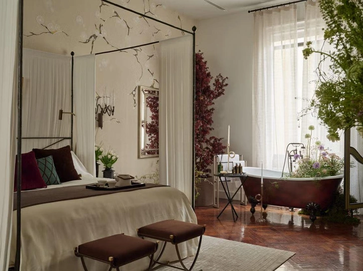 Архитектурная строгость кровати с балдахином смягчается искусной игрой тканей: белизна белых драпировок встречается с глубокими оттенками бархата. В ванной создали камерную атмосферу, а свежие цветы повторяют узор обоев с флористическим мотивом.