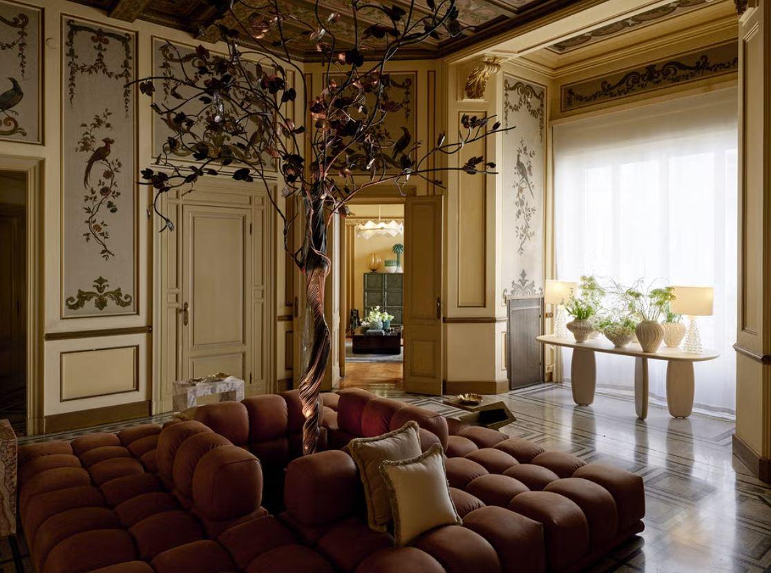 В центре пространства — металлическое дерево, ветви которого устремляются вверх, созданное Fucina di Efesto. Контраст очевиден: над головой — кессонные потолки в духе Тьеполо, а под ними — модульный диван цвета ржавчины и футуристические геометрические опоры (например, столик Zig Zag от Cupioli). Читальный зал задуман как более камерный уголок, вдохновленный гостиными исторических дворцов. Прямой оммаж Венеции — современный светильник из муранского стекла.