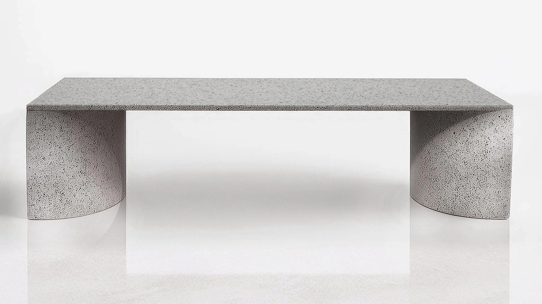 Легкий и пластичный материал во многом определил облик стола. С помощью термоформовки дизайнеру удалось создать плавный силуэт с двумя округлыми ножками, которые соединяются со столешницей без швов и стыков. Размер предмета мебели тоже был выбран не случайно, он кажется значительным, но не перегружает пространство, и позволяет материалу говорить самому за себя.
