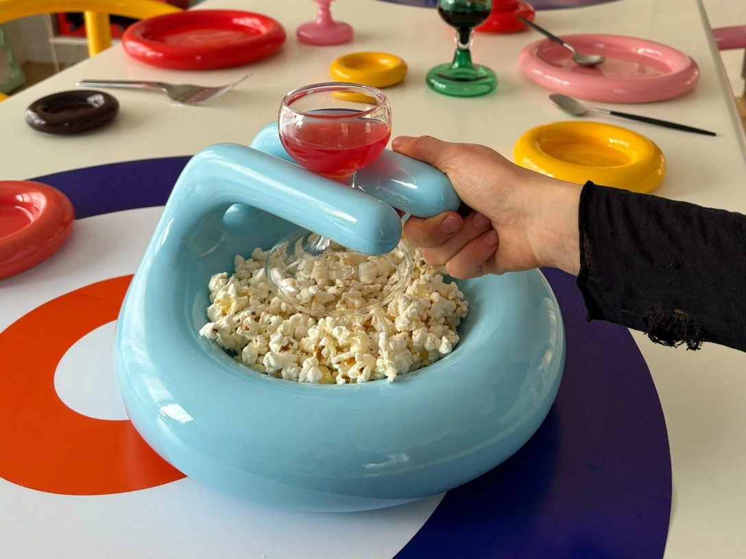 Кажется, у чайника Bulbul Акилле Кастильони (Achille Castiglioni) появился младший брат: шведский дизайнер Густав Вестман (Gustaf Westman) создал новый «дофаминовый» предмет, вдохновившись камнем для керлинга. Это чаша, куда можно насыпать закуски и заодно зацепить бокал вина. «Ручка предназначена для бокалов для вина, но, думаю, в бокал можно налить что угодно. Например, мы наливаем кетчуп в стакан, а картошку фри насыпаем в миску!», — говорит Вестман.