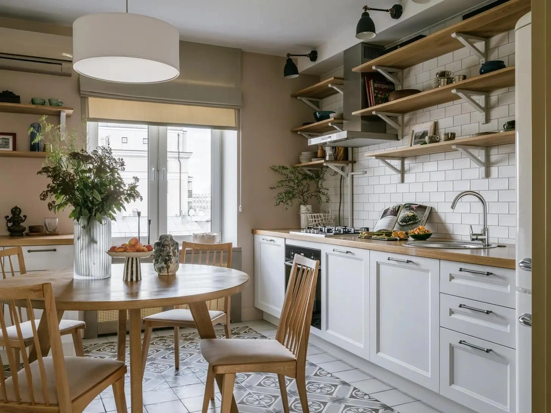 Идеальной основой станут нейтральные, землистые и пастельные тона: теплый белый, песочный, светло-терракотовый, оливковый и, конечно, натуральное дерево. Такая палитра визуально согревает пространство, делает его уютным и создает спокойную атмосферу, идеальную для приготовления пищи.