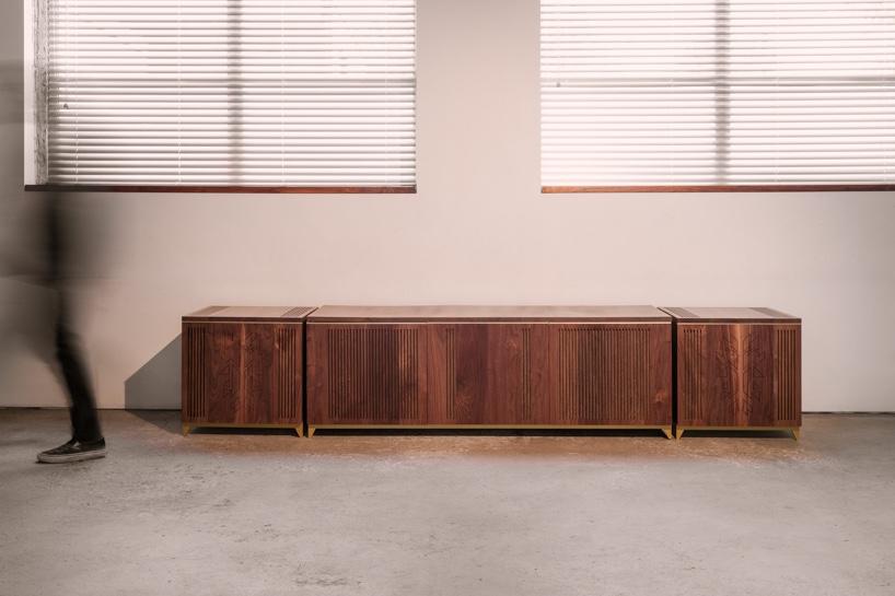 Изготовленный из американского ореха шкаф отсылает к оттенкам и материалам интерьеров отеля «Оверлук». Панели, обработанные на станке с ЧПУ, переосмысляют детали отделки стен из фильма, подчеркивая ритм и пропорции. Общая форма остается сдержанной и симметричной.