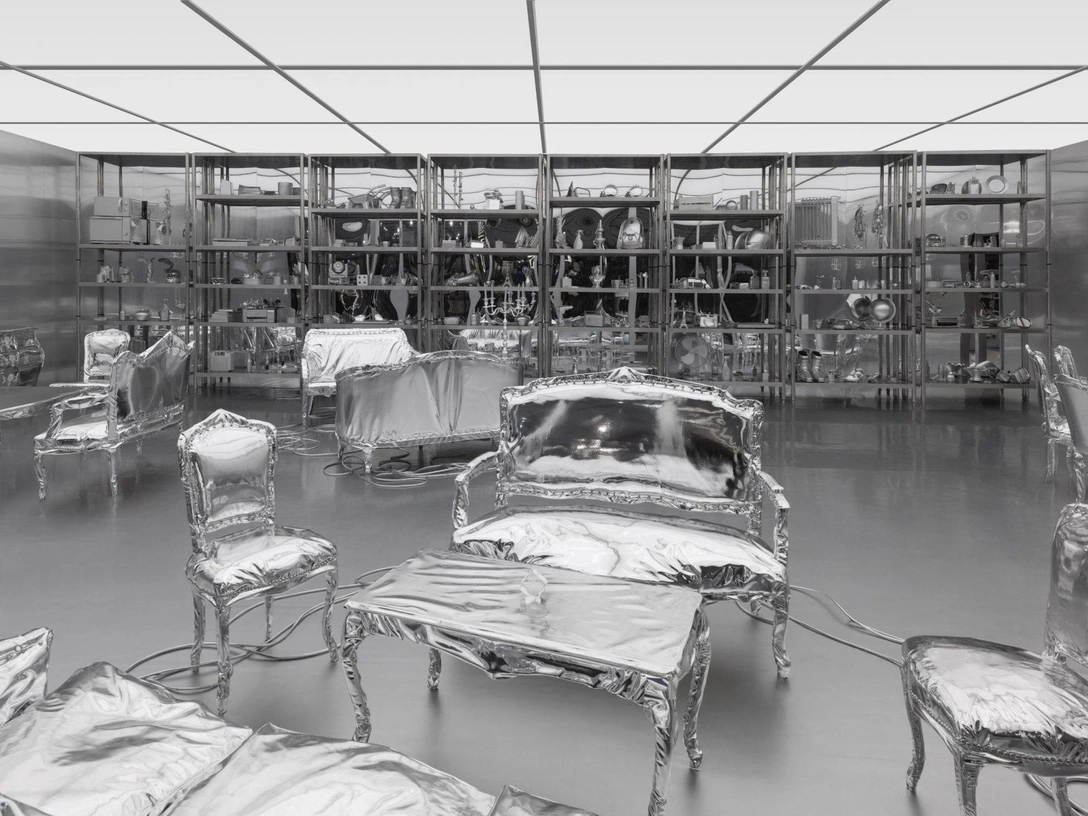 Инсталляция соответствовала теме выставки Maison&Objet 2026 «Прошлое раскрывает будущее»: исторические объекты предстали в футуристичном пространстве, где все было выполнено в металлизированной отделке. Дизайнер покрыл композицию из мебели и предметов блестящей серебристой тканью, создавшей драпировки и отражающие поверхности.
