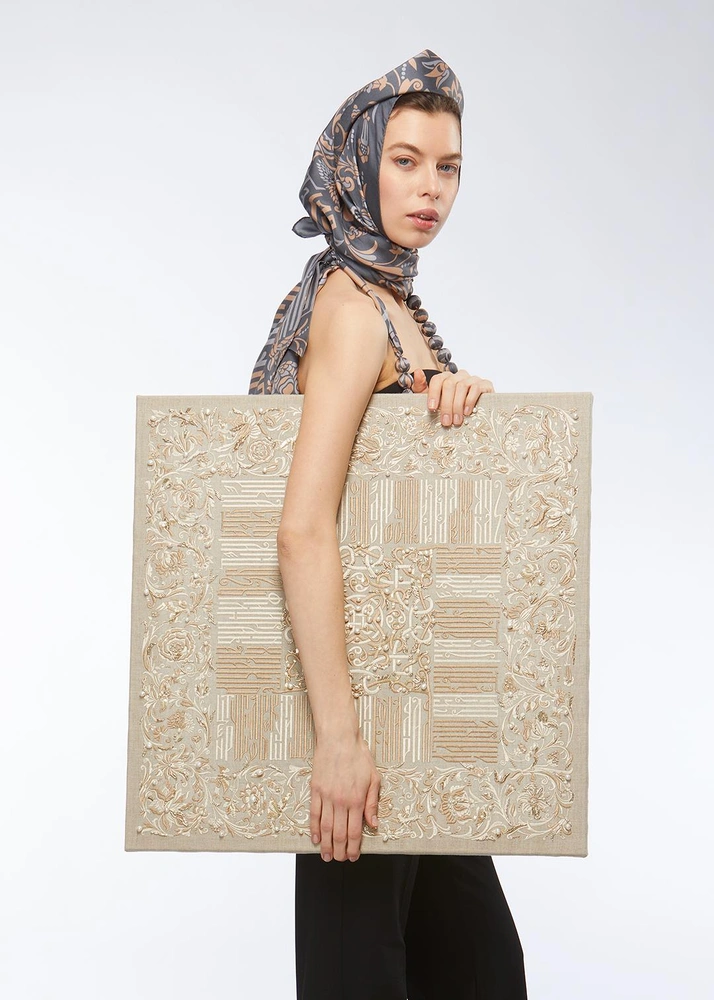 В коллекцию вошли шелковые платки, шали, маски, кокошники, ожерелья, колье, твилли, одежда и гобеленовые сумки-тоуты. Гобелены производятся на фабрике в Иваново и могут использоваться также для мебельной обивки и для других дизайнерских интерьерных решений.