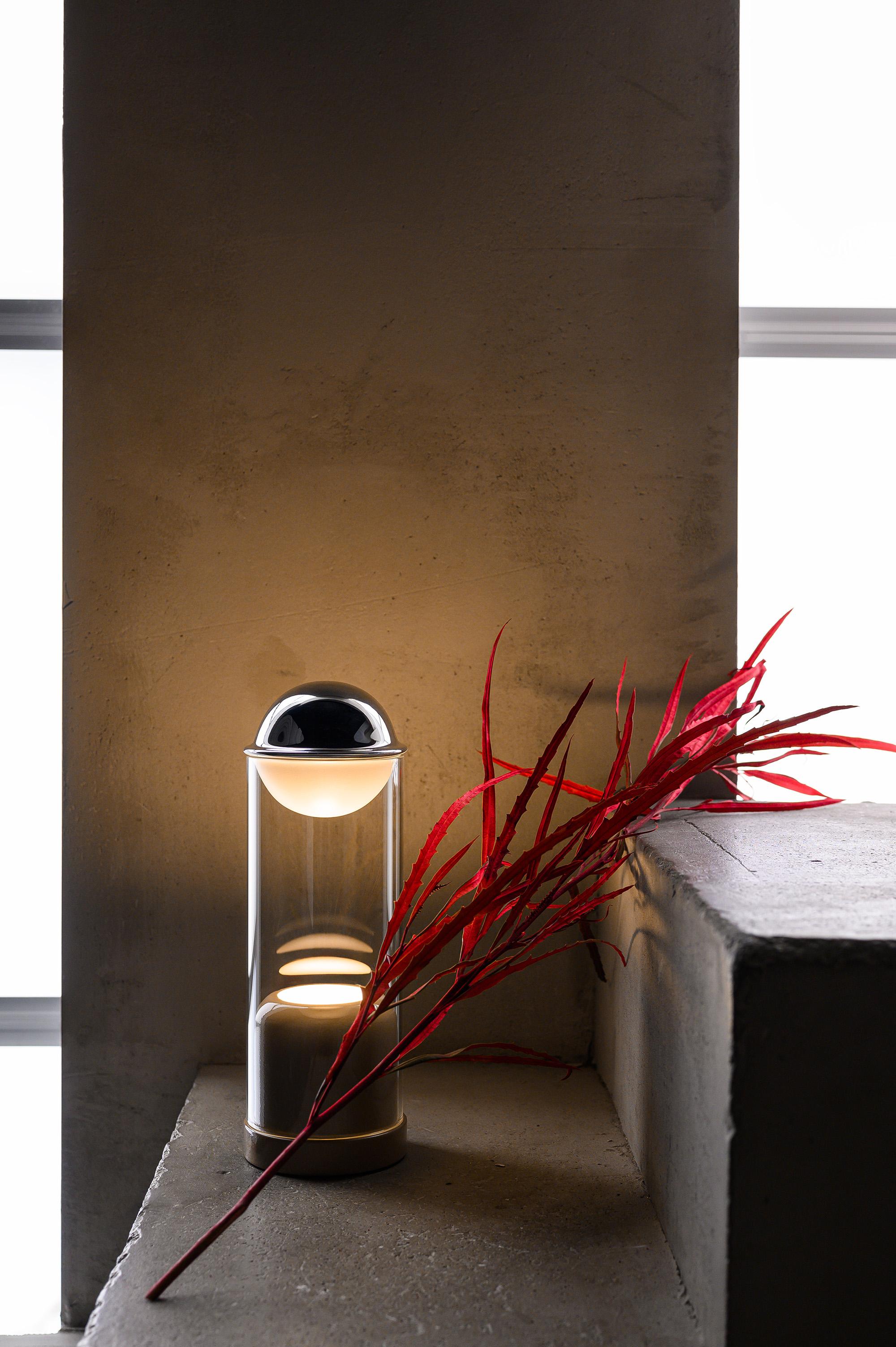 Вторая коллекция — Theorem — более спокойна, настраивает на спокойный вечер. При этом сценарии можно регулировать: от мягкого и уютного до акцентного света. Все устроено довольно интересно: лампа в основании светит вверх, и ее луч отражается от стеклянной сферы. Она двусторонняя: одна сторона матовая, другая зеркальная. Ее можно поворачивать, плавно регулируя яркость.