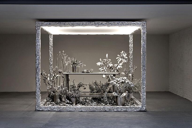 Инсталляция обрамлена конструкцией, созданной из алюминиевых лотков для барбекю, одного из любимых материалов основателя Crosby Studios Гарри Нуриева. Внутри — не только металлические цветочные композиции, но и обрезанные стволы, лепестки и другие отходы — словом, все, что обычно находится за кадром. У команд Crosby Studios и Flover получилось показать процесс, который стоит за любым красивым букетом, через его эстетизацию.