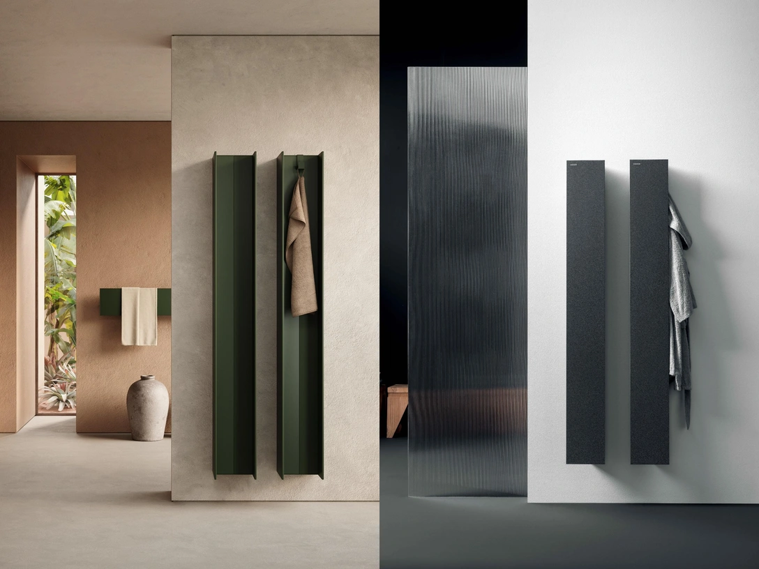 Serie T и Serie T1V выполнены в похожем минималистском духе. Их главное отличие друг от друга состоит в том, что у Serie T крючки находятся спереди, а у Serie T1V — справа, они скрыты за алюминиевым профилем, что позволяет немного спрятать полотенца и сохранить акцент на строгой геометрии радиатора.