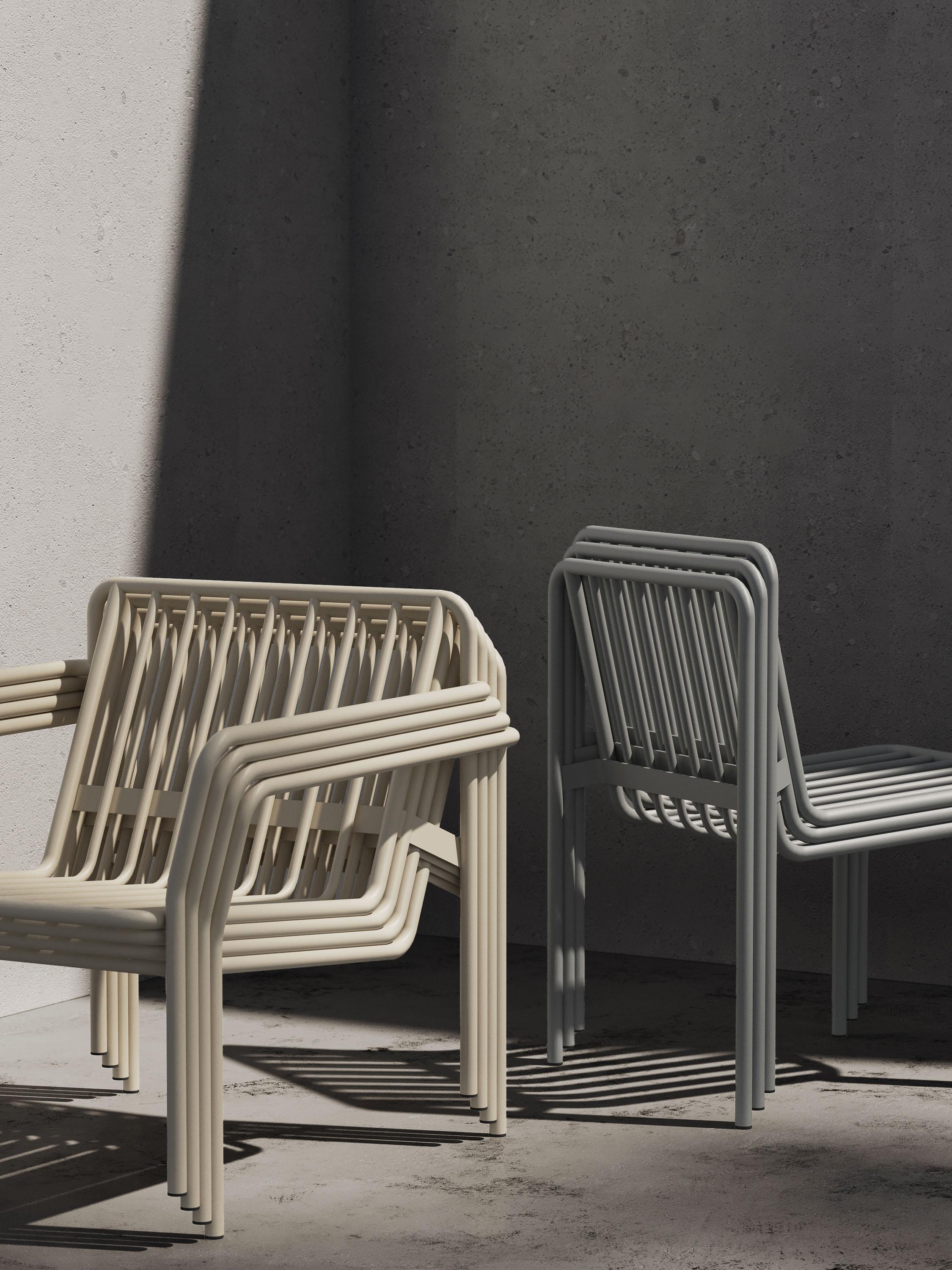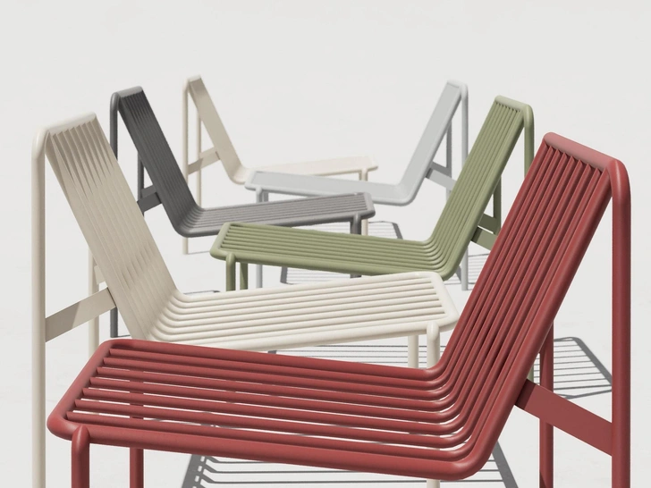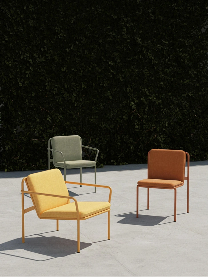 Всего в коллекции четыре предмета: обеденный стул с подлокотником и без него, лаунж-кресло, тоже с подлокотниками и без. Стулья штабелируемые, поэтому они удобны в кафе, ресторанах, гостиничных террасах и других городских проектах.
