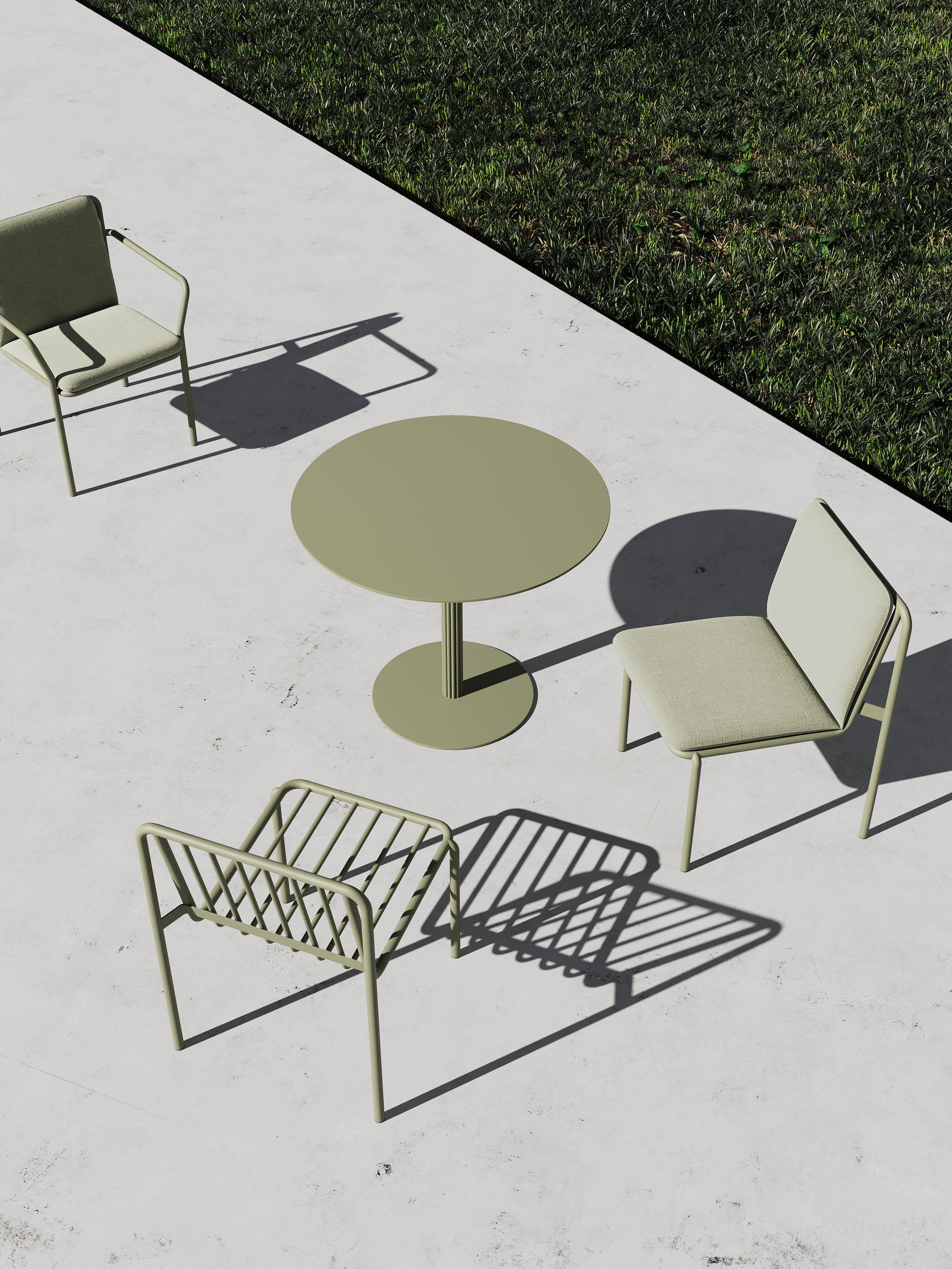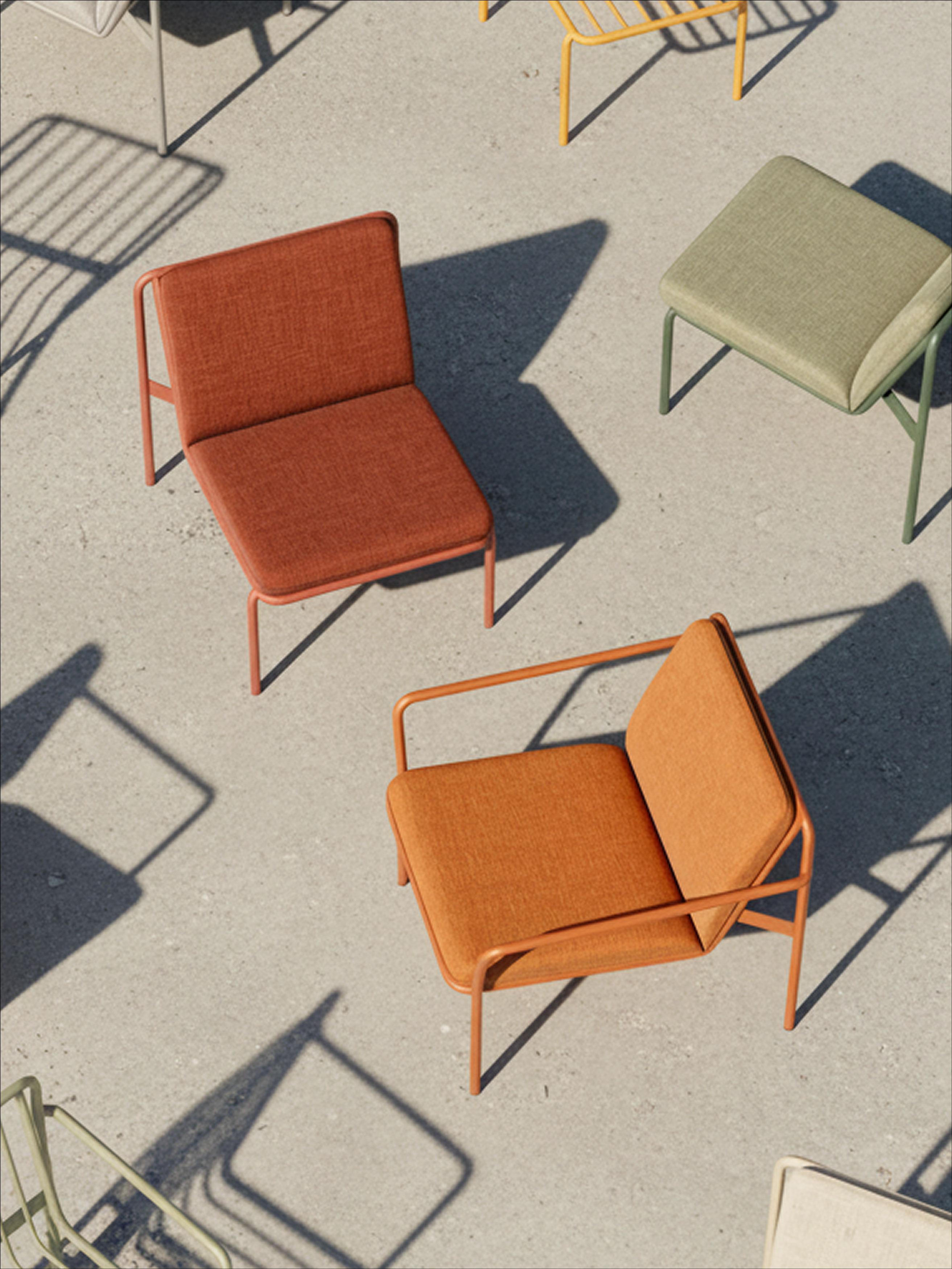 Загадочное концептуальное название 51°–7° Essen — это географические координаты города Эссен. Все потому, что дизайнеры вдохновлялись индустриальной архитектурой Рурского региона и эстетикой немецкого модернизма. «Коллекция отказывается от привычного образа аутдор-мебели как части курортной среды и работает с архитектурным языком города», — объясняет команда.