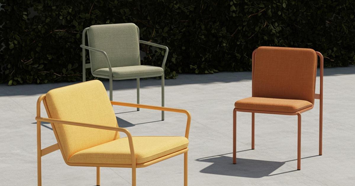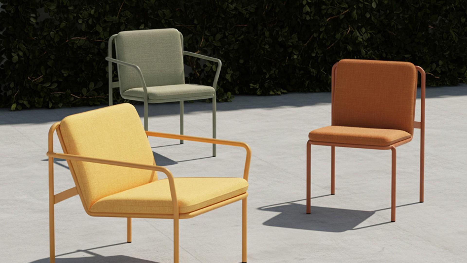 Каркас — из стали, с порошковым покрытием. Металл проходит антикоррозийную обработку, чтобы быть устойчивым к разным условиям. Для мягкости у стульев есть съемные подушки, они изготовлены из водоотталкивающих outdoor-тканей, рассчитанных на городскую среду. Они не только устойчивы к погодным условиям, но и сохраняют форму.