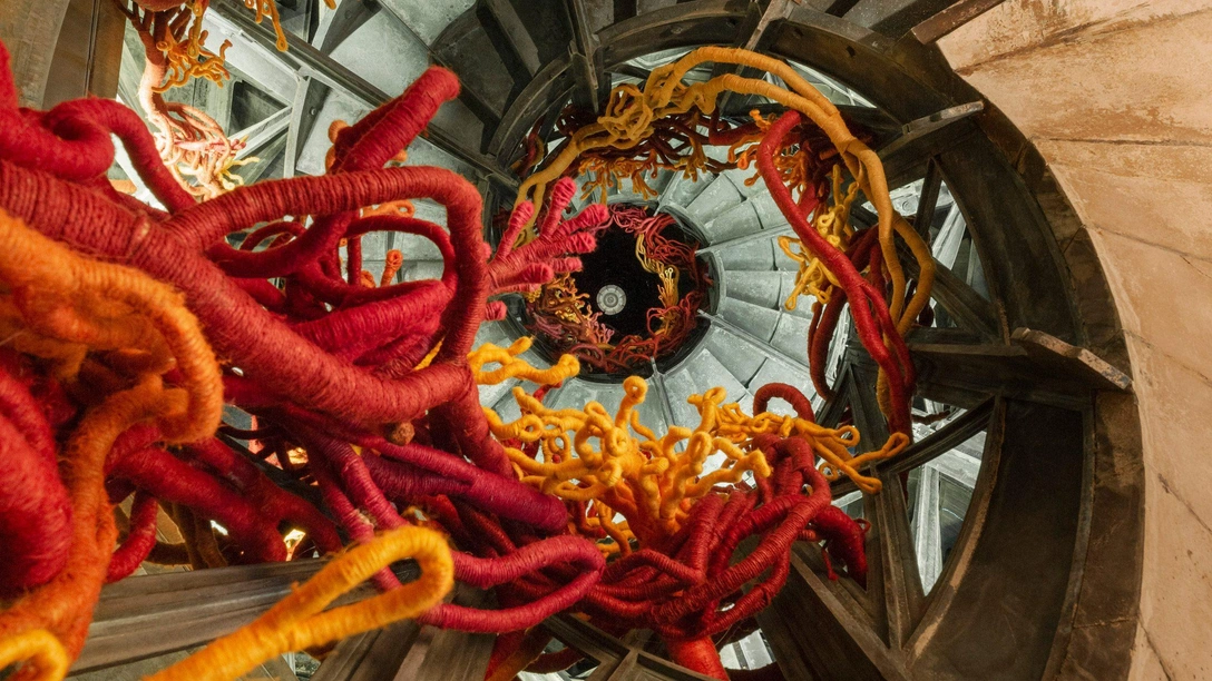 Инсталляция «Кораллы Свободы» Од Франжу состоят из десятков плетеных из льна ветвей, свисающих от пола до потолка во внутренней ротонде памятника. Это первый арт-проект, установленный внутри знаменитой Июльской колонны, воздвигнутой в 1835 году в память о революции 1830 года.