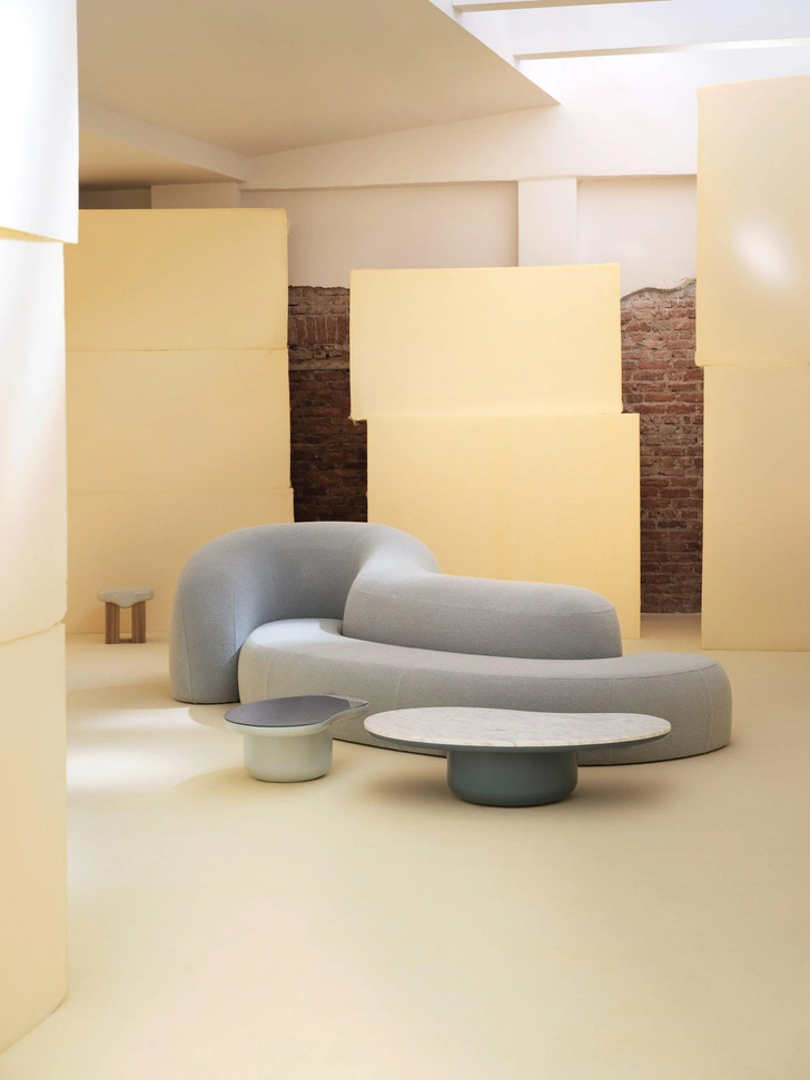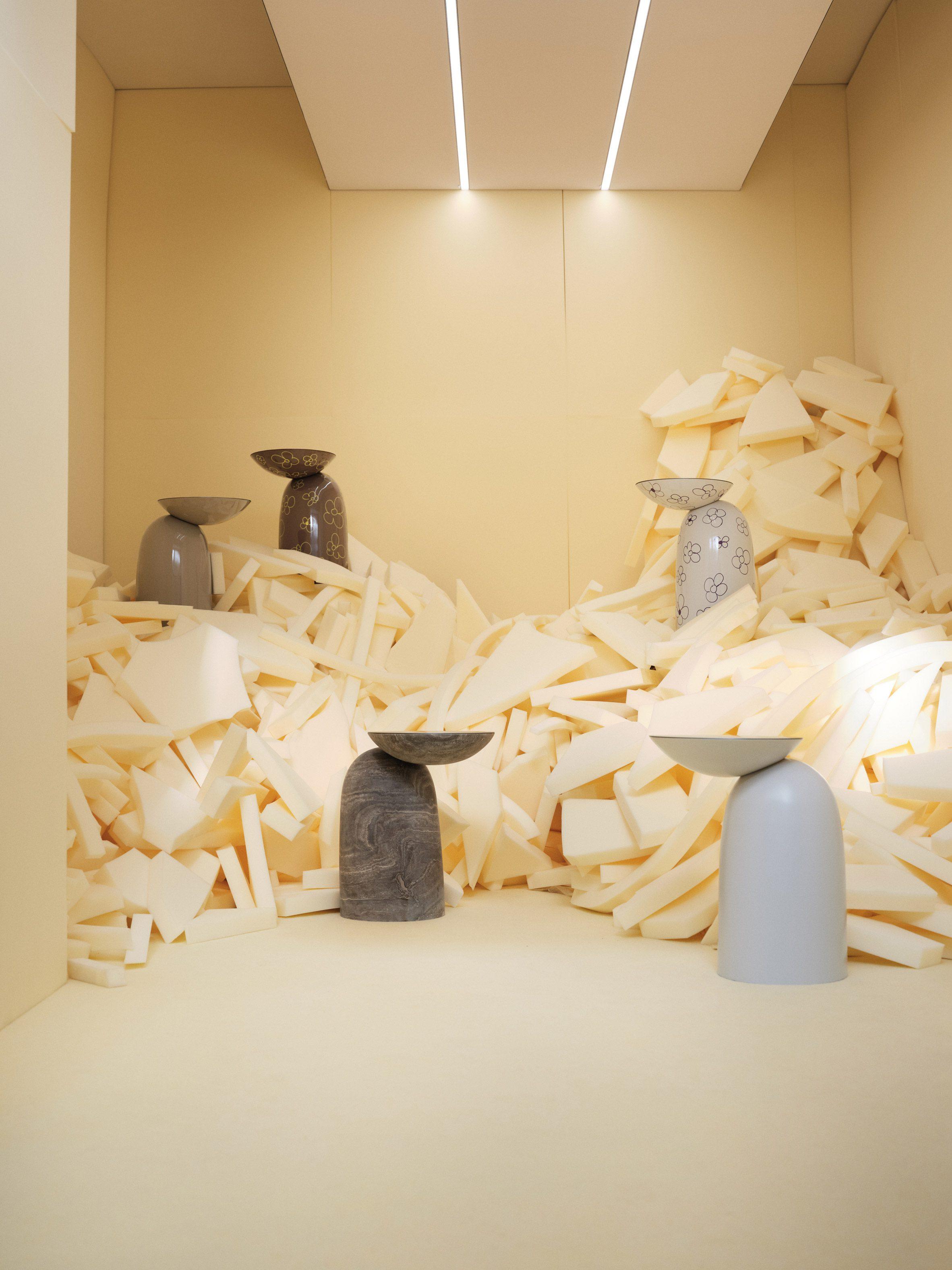 Диван поставили в центре инсталляции, а стены вокруг сделали из пены, которую используют для производства мебели. Secolo производит много вещей из этого материала, и на фабрике всегда есть обрезки и куски, которые еще не пустили в производство.
