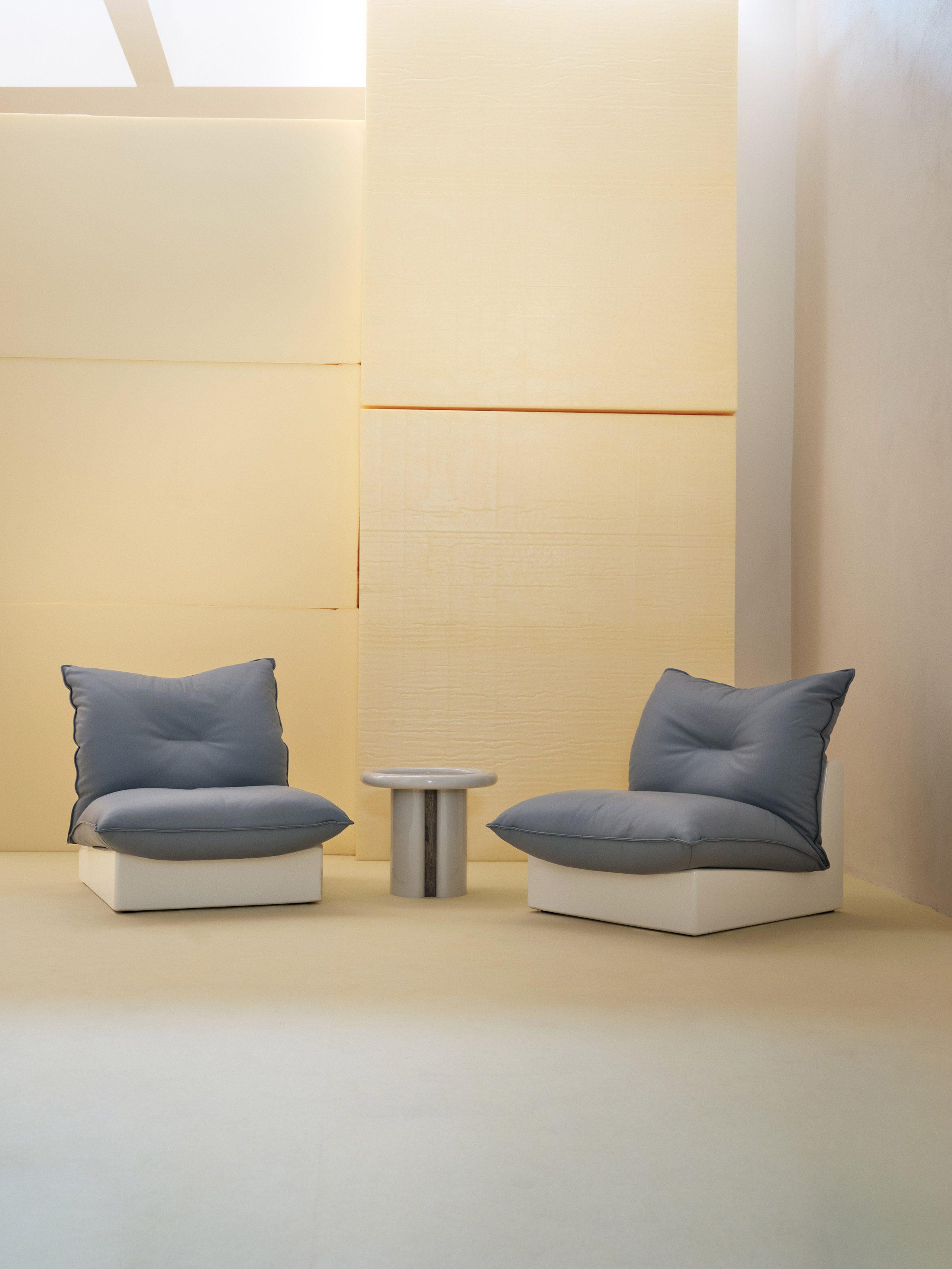 Кроме этих двух предметов от Tableau, Secolo показал и свое новое кресло Plumea. У него сиденье и спинка сделаны как подушки — мягкие, объемные, приятные на вид. Оно продолжает тему комфорта и тактильности.