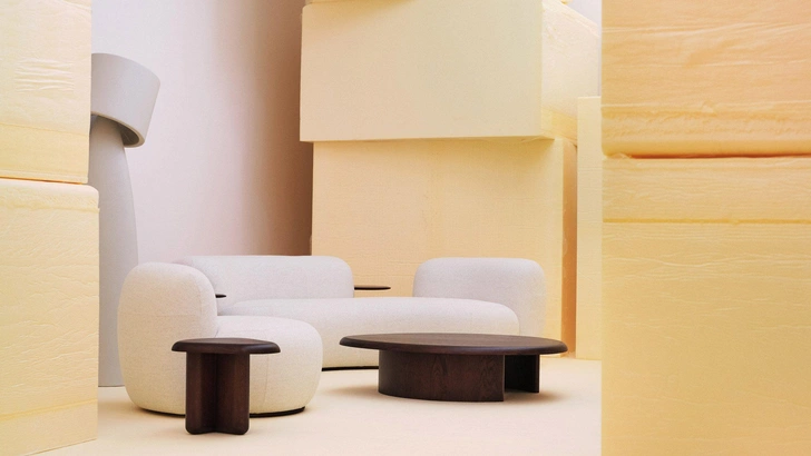 Они похожи на гигантские брикеты сливочного масла — желтые, мягкие на вид, хотя на самом деле довольно плотные. А после выставки эти блоки вернутся на фабрику и из них сделают обычную мебель — ничего не пропадет.