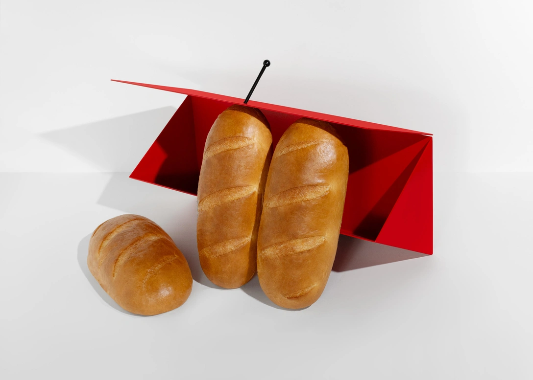Яркий красный цвет металлической хлебницы — символ жизни, а центральный элемент (черный стержень) — метафора единой надежной опоры. По сравнению с размерами хлебницы он может казаться хрупким и ненадежным, но это не так — он напоминает, что часто видимое может быть обманчиво, а истинное сокрыто от глаз.