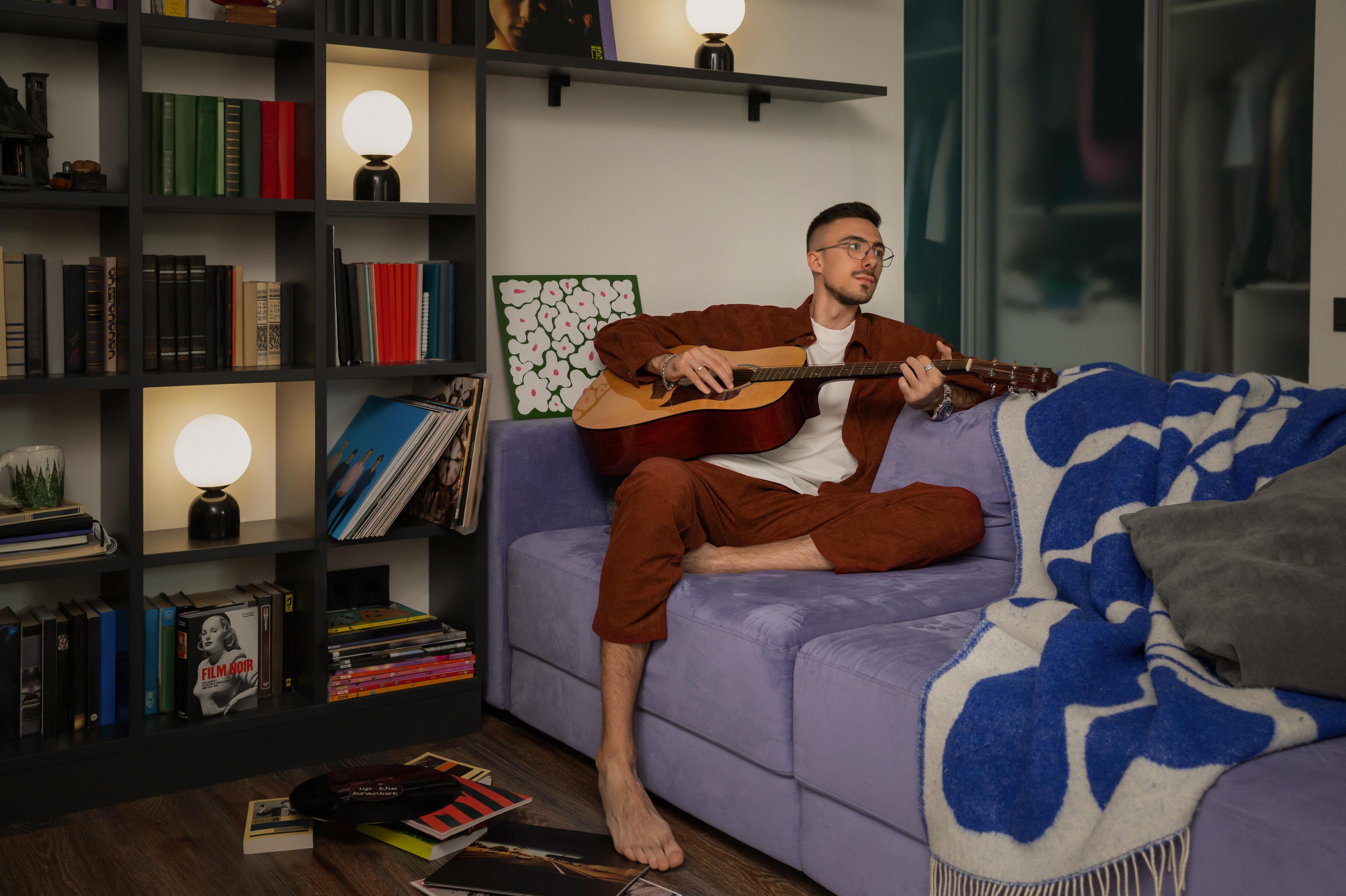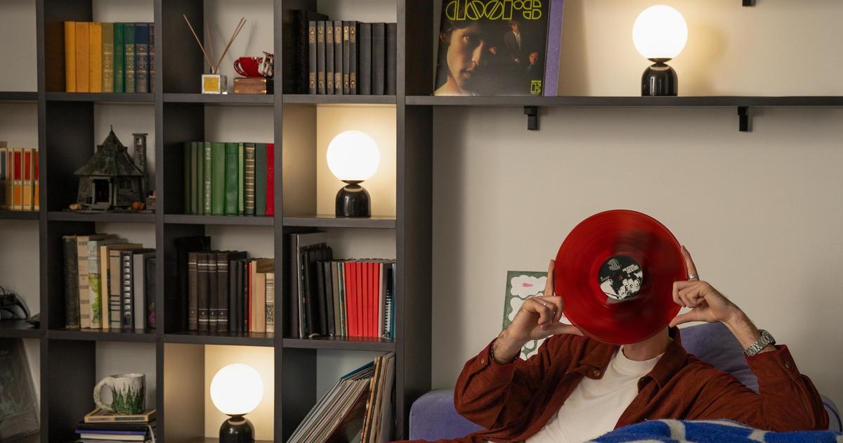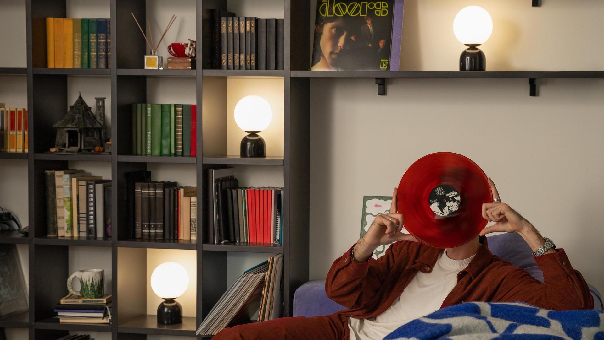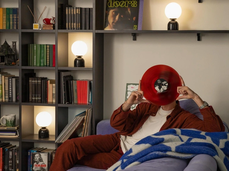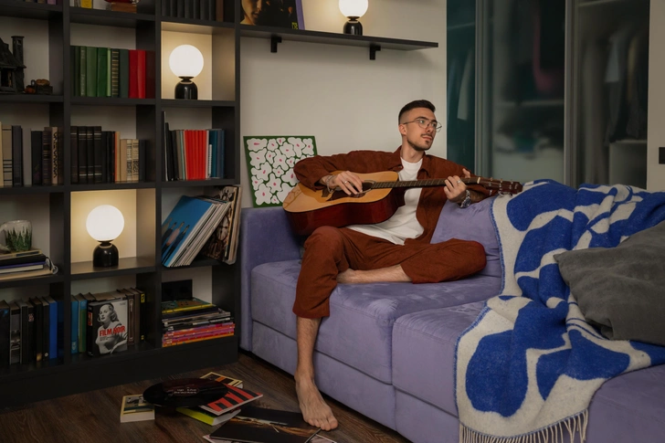 А теперь проверим, как изменится пространство и наш герой в нем, если мы заменим только световой сценарий. Тот же герой, те же пластинки и любимая гитара, но спальня вдруг приобретает совершенно иную глубину. Если предыдущая коллекция давала ощущение мягкого комфорта, то Fossil работает более тонко и прицельно.