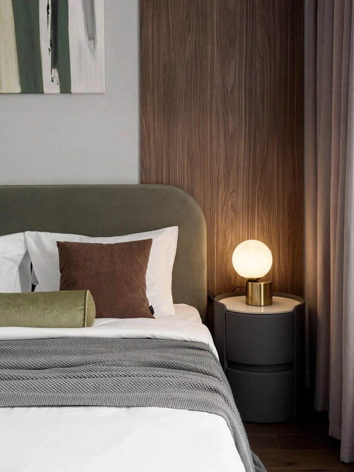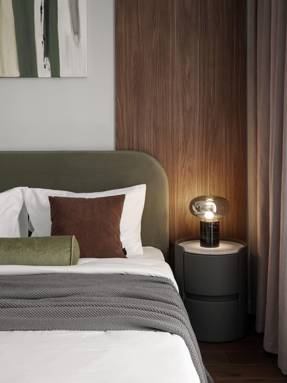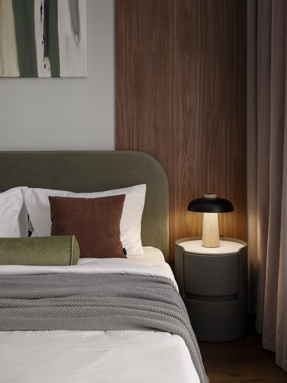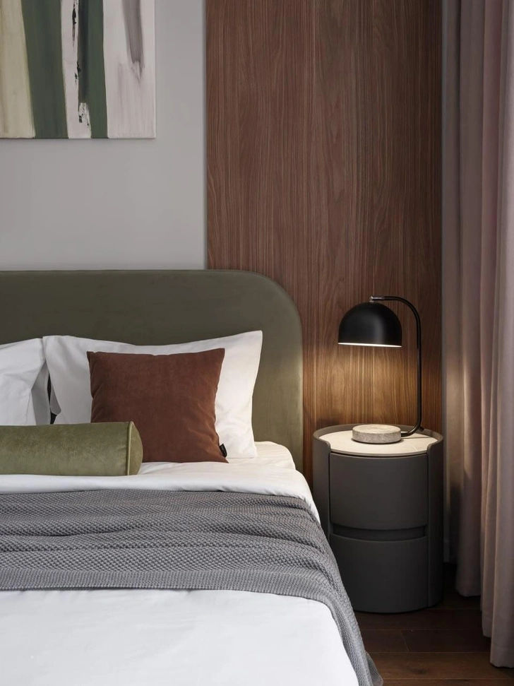 А это уже модель Barrel — и совсем другой эффект. Как только загорается этот свет, пространство словно наполняется теплом. Название модели говорит само за себя: светильник добавляет интерьеру мягкости и уюта. В таком сценарии спальня превращается в безопасное и теплое убежище, где свет дает ощущение спокойствия и домашнего комфорта.