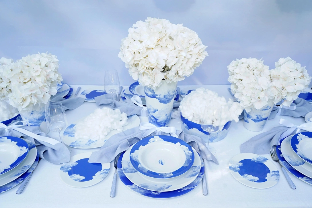 Французский дизайнер Дмитрий Рыбалченко создал коллекцию столовой посуды Reverie для Fürstenberg. В оттенках синего и голубого на тарелках, молочниках, сахарницах и чашках изображены облака, в которых можно разглядеть разных животных, — прямо как в летний день, когда взгляд так и тянется к небу, угадывая образы в проплывающих мимо тучках.
