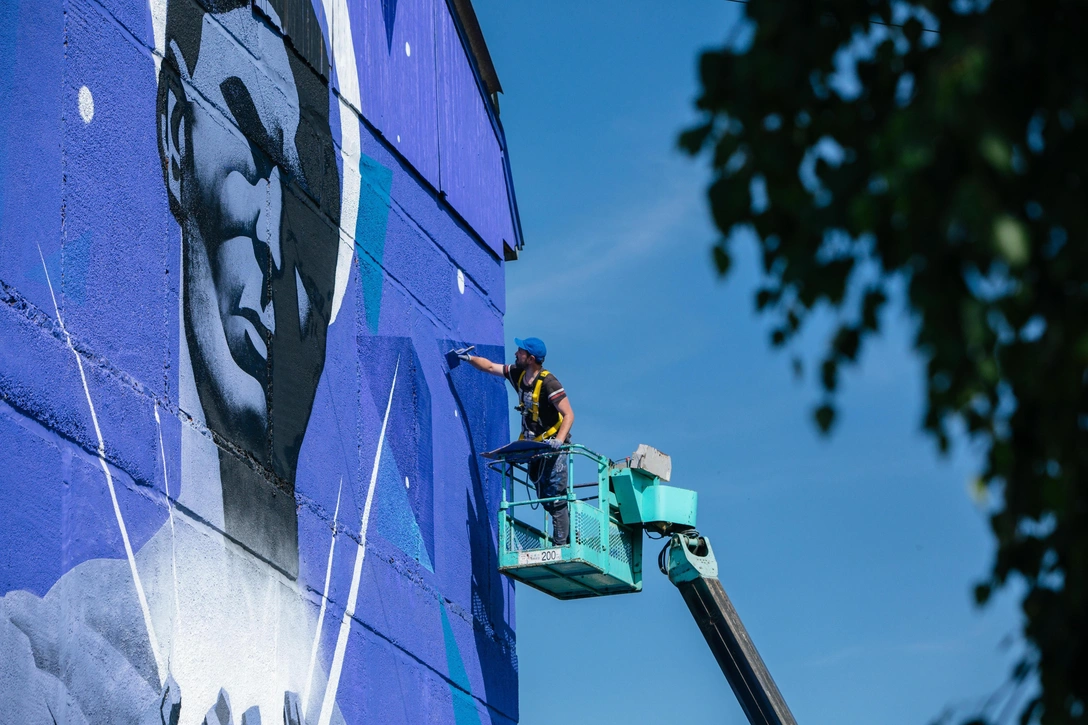 За полярным кругом художники фестиваля создали сразу несколько работ. Мурал Андрея Бергера — часть масштабного триптиха, посвященного Ковдору. «Центральный мотив — проект будущего „суперкарьера“, который к середине века достигнет глубины около 700 метров. Эта воронка, видимая из космоса, становится метафорой взаимодействия человека и планеты», — говорит автор. Индустриальный ландшафт города раскрывается через картографические данные, геологические разрезы и визуальные паттерны, связанные с регионом: например, здесь можно найти флаг Мурманской области.