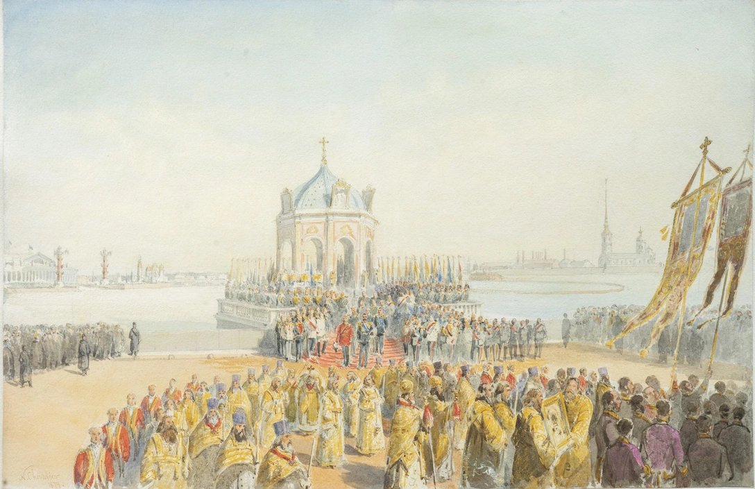 На акварельном рисунке «Праздник Водосвятия при Александре II у Зимнего дворца» Николя Шевалье запечатлен сюжет, который крайне редко встречается в живописи и графике, — церемония освящения воды на Крещение у Зимнего дворца, или Водосвятие. Художник изобразил пышное торжественное шествие: на переднем плане священники в праздничных облачениях несут икону, кресты и хоругви.