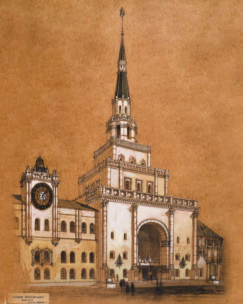 Здание Казанского вокзала выстроено в стиле модерн Алексеем Щусевым, который начал проектирование в 1913 году привлек к оформительским работам самых модных художников своего времени — Бенуа, Кустодиева, Добужинского, Лансере, Серебрякову. По ряду причин, которые понятны всем, кто помнит историю двадцатого века, строительство завершилось только в 1940-м, не все задуманное автором проекта было воплощено.